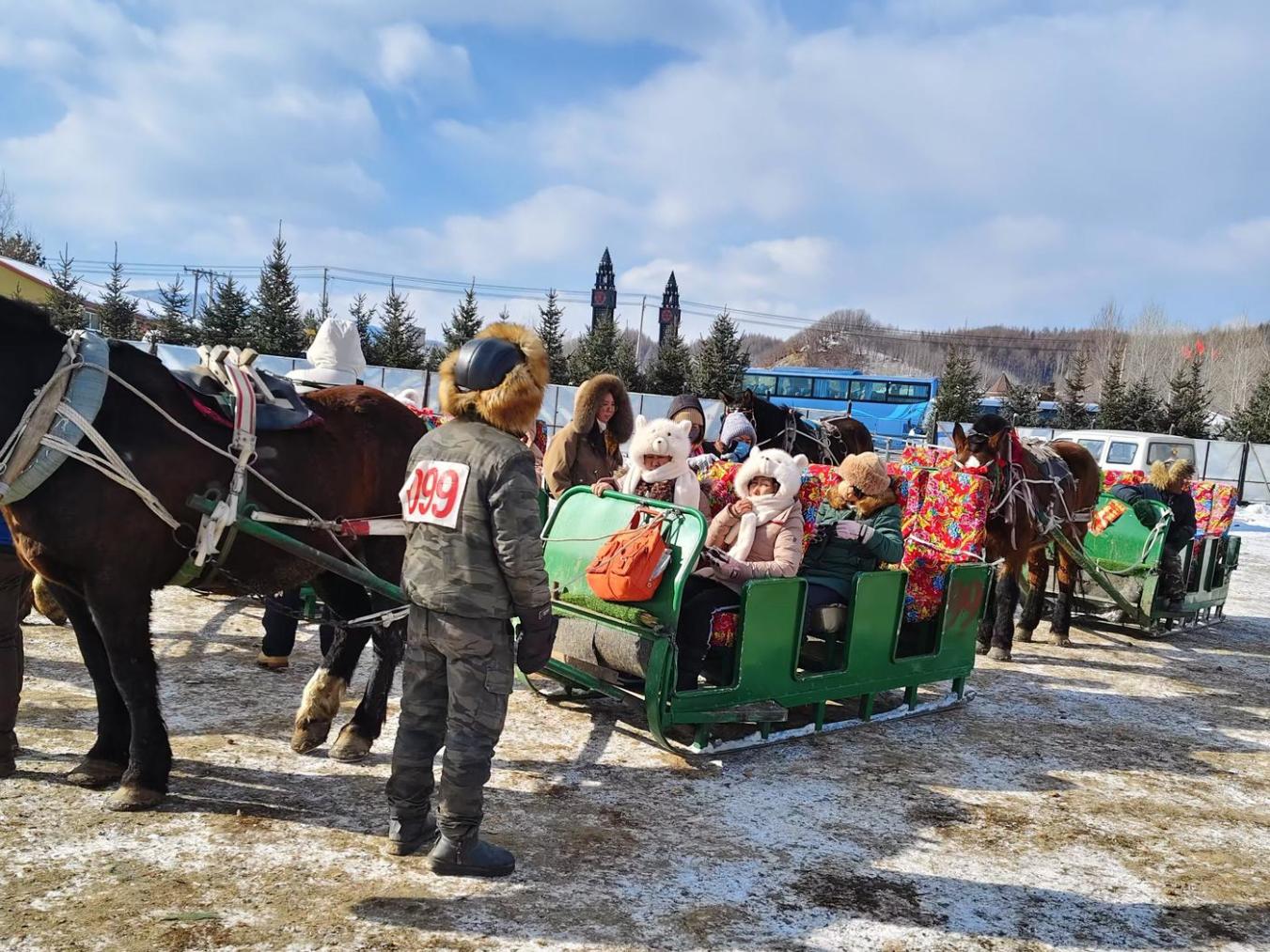 缰绳一甩,骏马嘶鸣,青山村大东北马拉爬犁队雪场的一批批游客排着队,等待体验马拉爬犁这一由东北传统的交通工具衍变而来的旅游项目。耳畔呼啸的风声与马蹄踏雪的“咯吱”声和声共鸣,让人无比畅快。