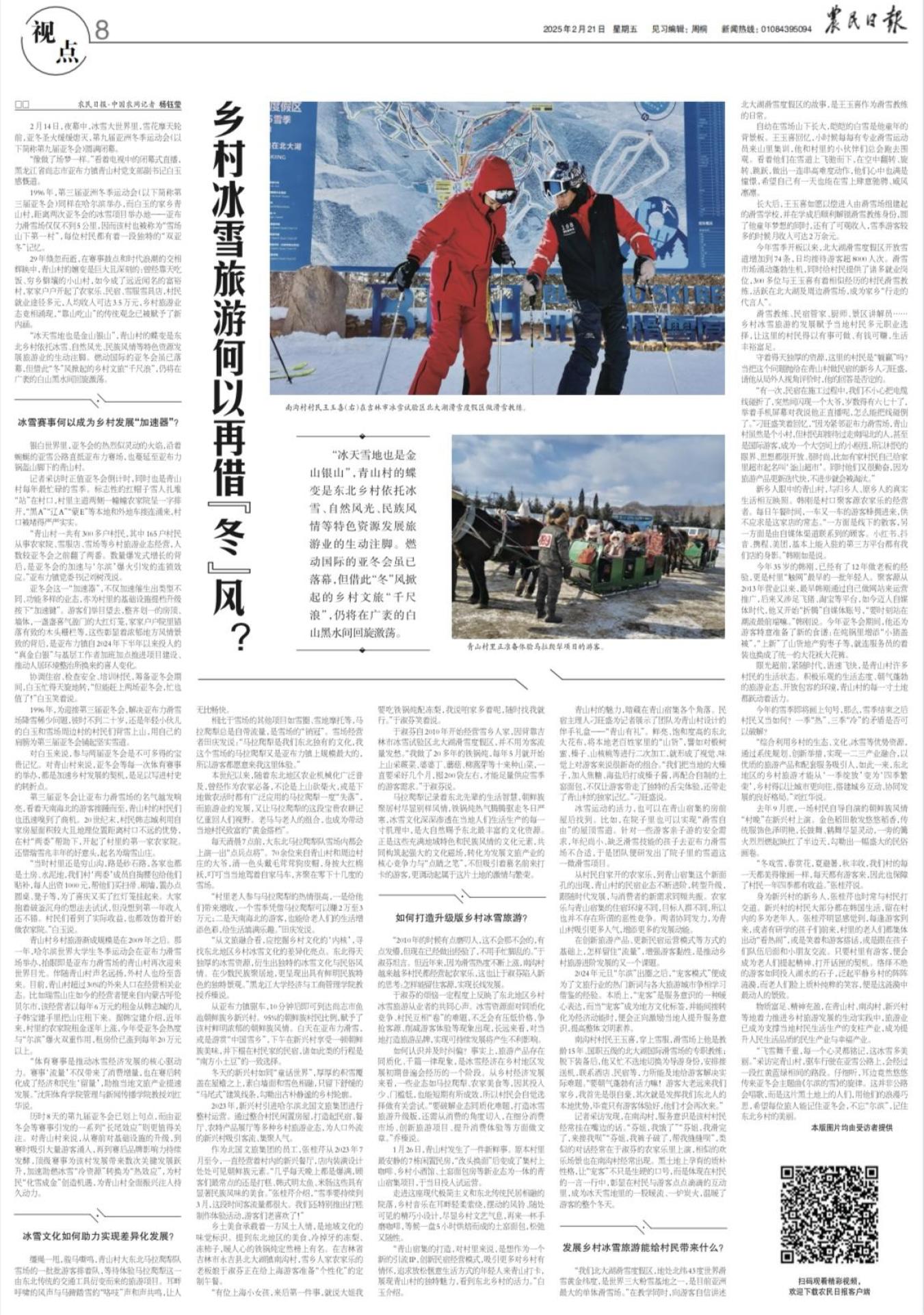 “冰天雪地也是金山银山”,青山村的蝶变是东北乡村依托冰雪、自然风光、民族风情等特色资源发展旅游业的生动注脚。燃动国际的亚冬会虽已落幕,但借此“冬”风掀起的乡村文旅“千尺浪”,仍将在广袤的白山黑水间回旋激荡。