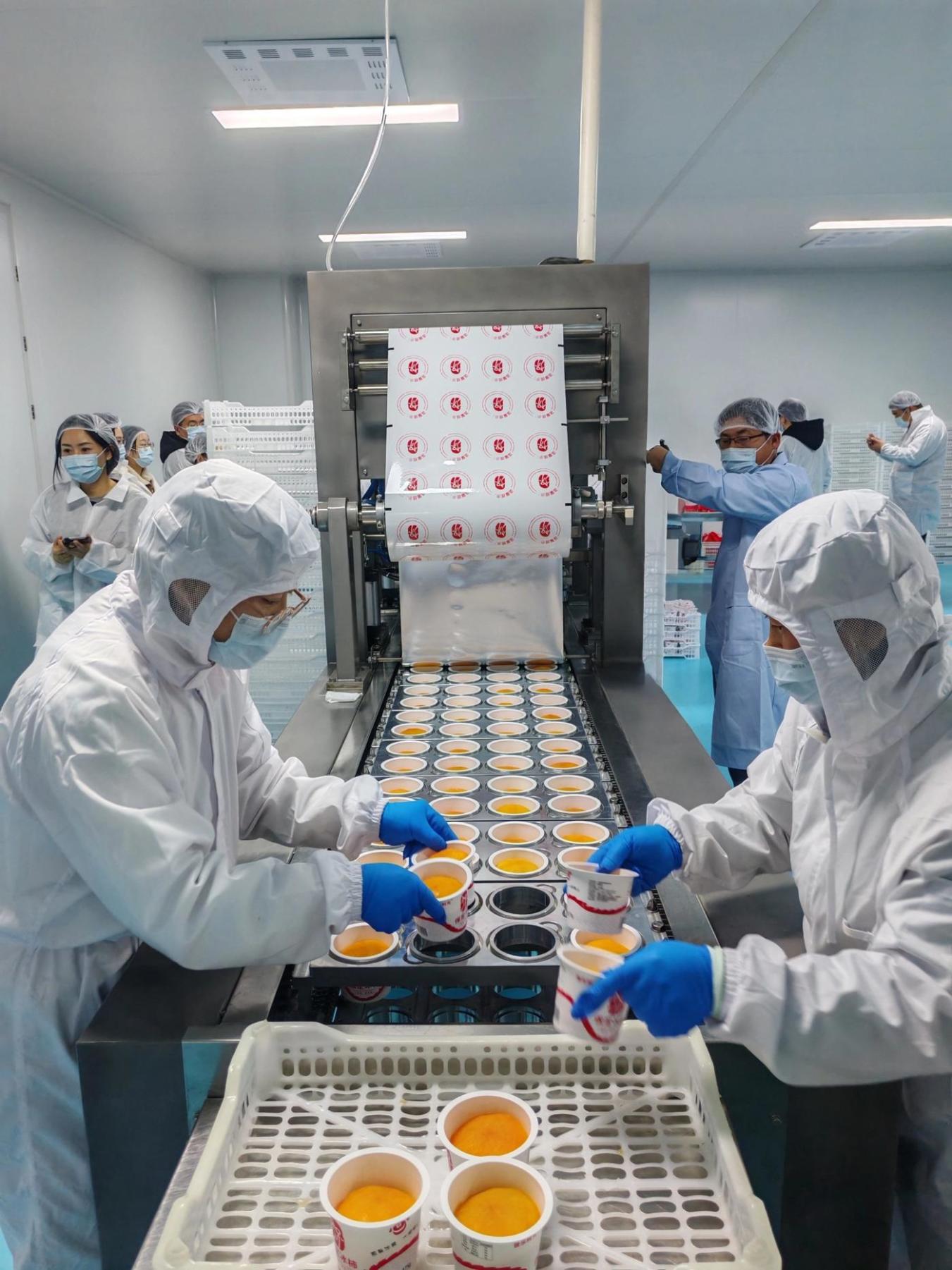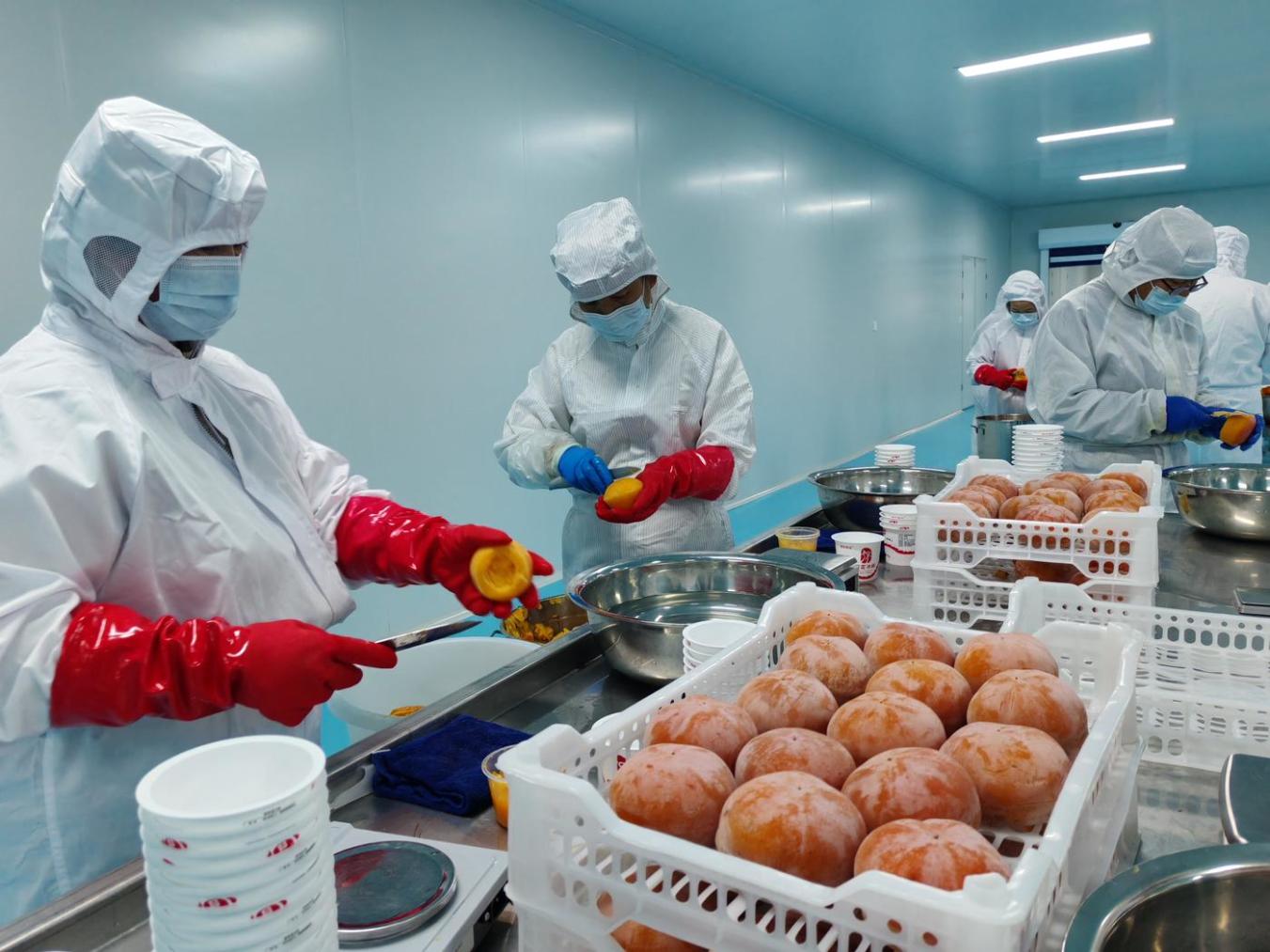 从零下18至20摄氏度的冷库中出料,直接进入严格杀菌的加工车间,脱色糖化后单果都在250克以上的磨盘柿,要经过挑选清洗、去皮称重、杀菌覆膜、放勺压盖等流水线工序,最后才能检验封箱入库冷藏。沃隆公司的冰柿生产技术负责人郭伟告诉记者:“公司建有5座专用冷库,每座库容60吨,可随时保证原料收储、货品发运需要。”