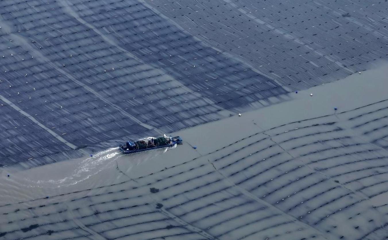 近日,一艘海上养殖作业船穿行在莆田南日岛海域的龙须菜养殖区(无人机照片)。新华社记者魏培全摄