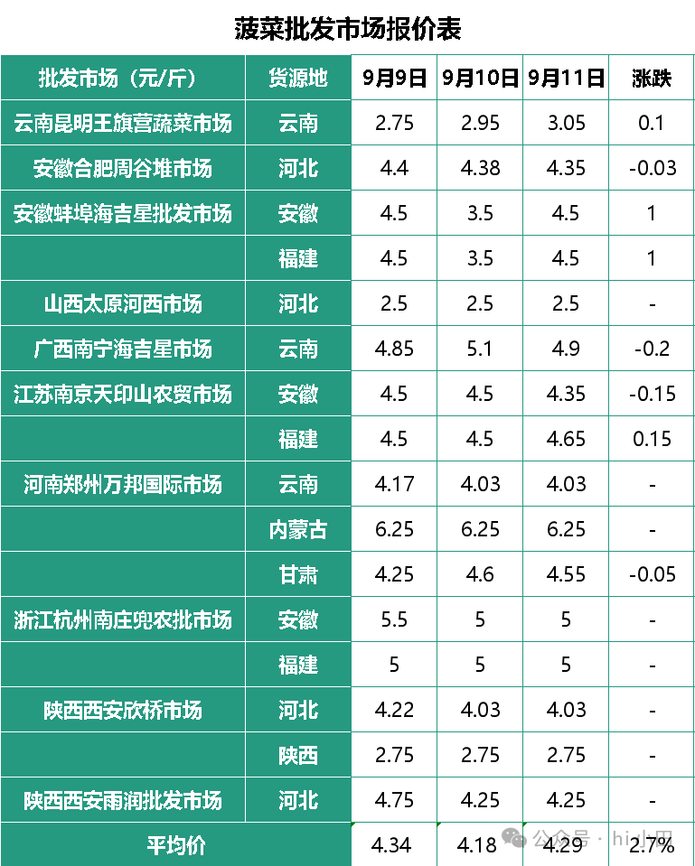 9月11日,批发市场菠菜价格小幅提升,平均价为4.29元,涨幅2.7%,其中安徽蚌埠海吉星批发市场菠菜价波动幅度较大,各产区菠菜价具体变化为: