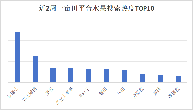 总体来看,现在水果市场是“以柑橘为王”,在搜索热度最高的前10个单品种,共有8个都是柑橘类水果,仅有红富士苹果和车厘子成为“唯二”的非柑橘类产品。