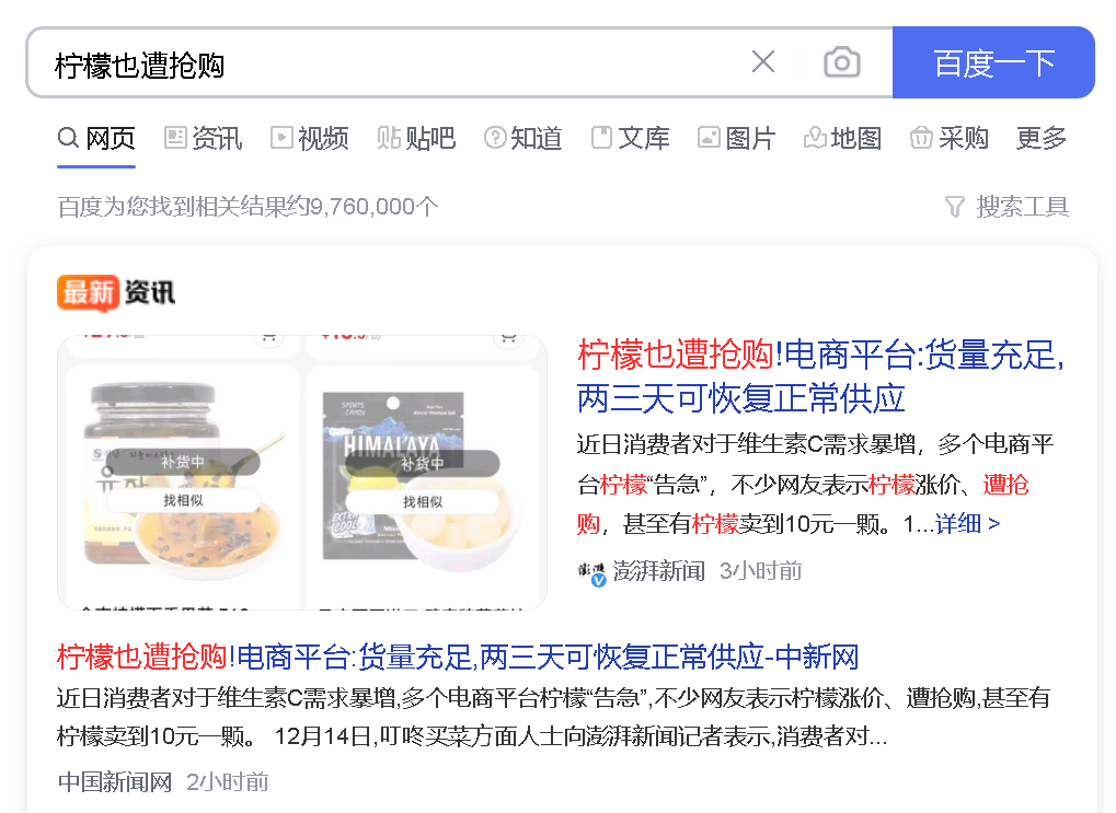 最近,随着疫情政策的调整,个人防护意识的加强,各种对抗疫情的食品采购热度持续上涨。今天,柠檬抢断货的新闻一度登上百度热搜。
