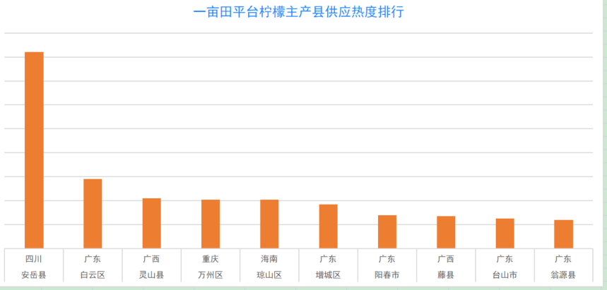 在一亩田这个覆盖全国2800多个县、1.5万种农产品的B端交易服务平台,柠檬不算是大品类,但也做到了全国各个主产区几乎无死角覆盖,其中安岳以绝对优势占据平台供应热度的首位,几乎是后面3个县的总和。柠檬在安岳种植历史悠久,现有柠檬保存面积48万亩,常年产量60万吨,相当于全国每人都能分到约1斤。