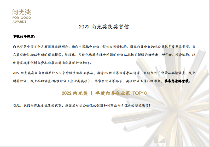 12月1日,在刚刚落幕的中国社会企业影响力投资论坛2022向光年会上,一亩田CEO邓锦宏荣获“2022向光奖|年度向善企业家TOP10”称号。该奖项由向光未来、财新国际、创业邦等联合主办,旨在表彰各领域以可持续商业行为创造社会价值的杰出代表,邓锦宏以11年间用数字技术的普惠应用服务中国农业,全力推动乡村振兴与共同富裕的社会实践获选。同期获选代表还包括爱尔眼科医院董事长陈邦、安踏体育创始人家族丁和木、丁世家、丁世忠等人。