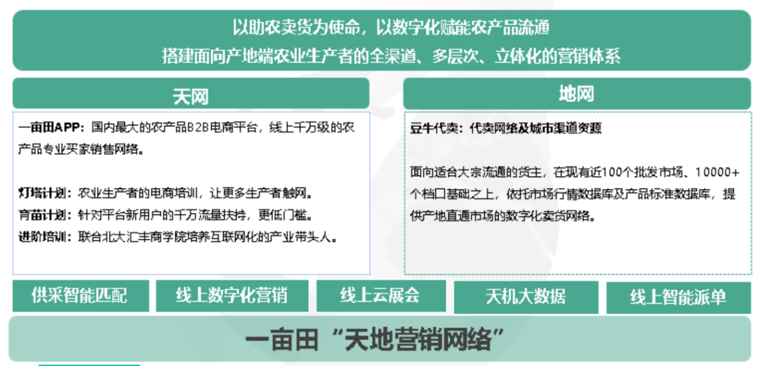 成立11年间,一亩田从0起步,搭建了农产品流通的“天地网络”,包括农产品及食品B2B数字流通平台一亩田APP、农批市场智慧化代卖服务网络豆牛代卖,同时搭建起全国农产品B2B流通大数据系统—天机大数据,为乡村产业提供“最强大脑”。如今,活跃着4400万新农人的一亩田带动每年2000多亿的农产品交易额,已经成为中国农产品B端流通的数字化基础设施。
