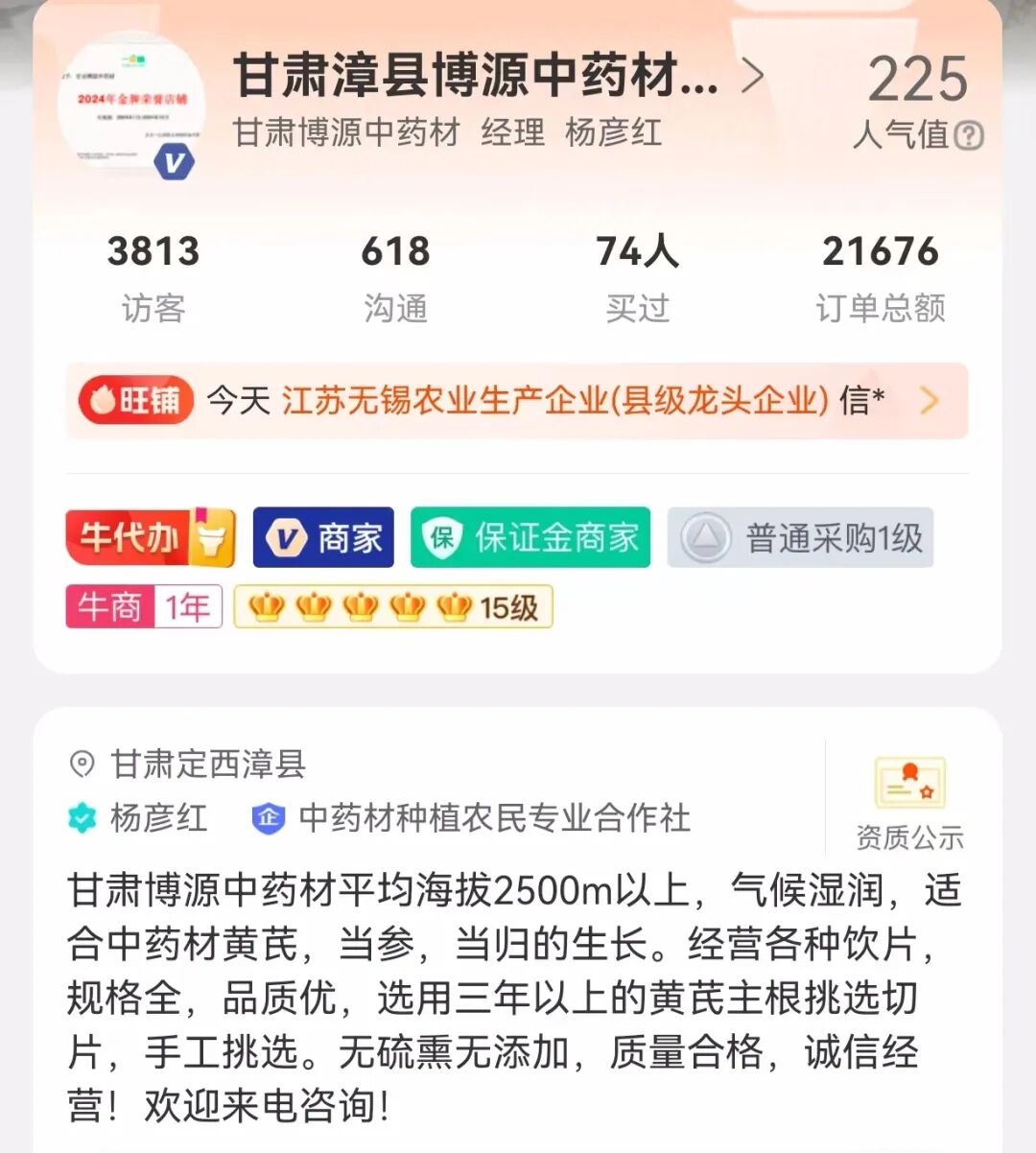 在种植加工过程中都严格把控质量,产品质量好,因此杨彦红线上店铺开通仅4个月,就收获了3000多位客户,而且不少客户都对杨彦红的产品质量很满意。他的客户,即有中药材、饮片商家,也有不少一些小型中药铺、药厂,北到黑龙江、南到广东,四川等地都有杨彦红的客户。