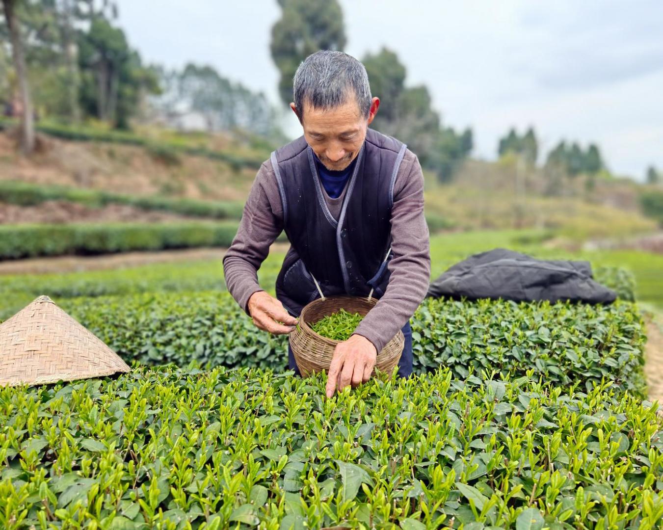 当水利建设的“硬仗”在粮田上打响时,另一场与时间赛跑的“变现战”正在海拔较高的张场镇茶山上演。