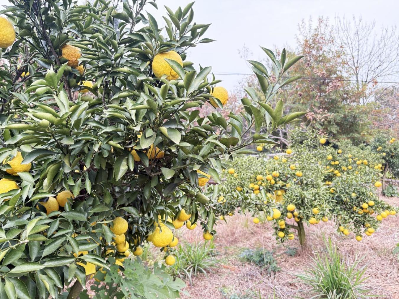 “黄金贡柚为橘与柚杂交的新品种,皮色金黄,果型扁圆,外形似橘非橘甜于橘,似柚非柚而香于柚,个头比柑橘稍大,顶部有类似铜钱的盖印。”金甲梨园负责人介绍,黄金贡柚成熟晚,一般在12月中旬才成熟采摘。不过黄金贡柚耐储藏,鲜果可存放10天以上,春节前后口味更佳。