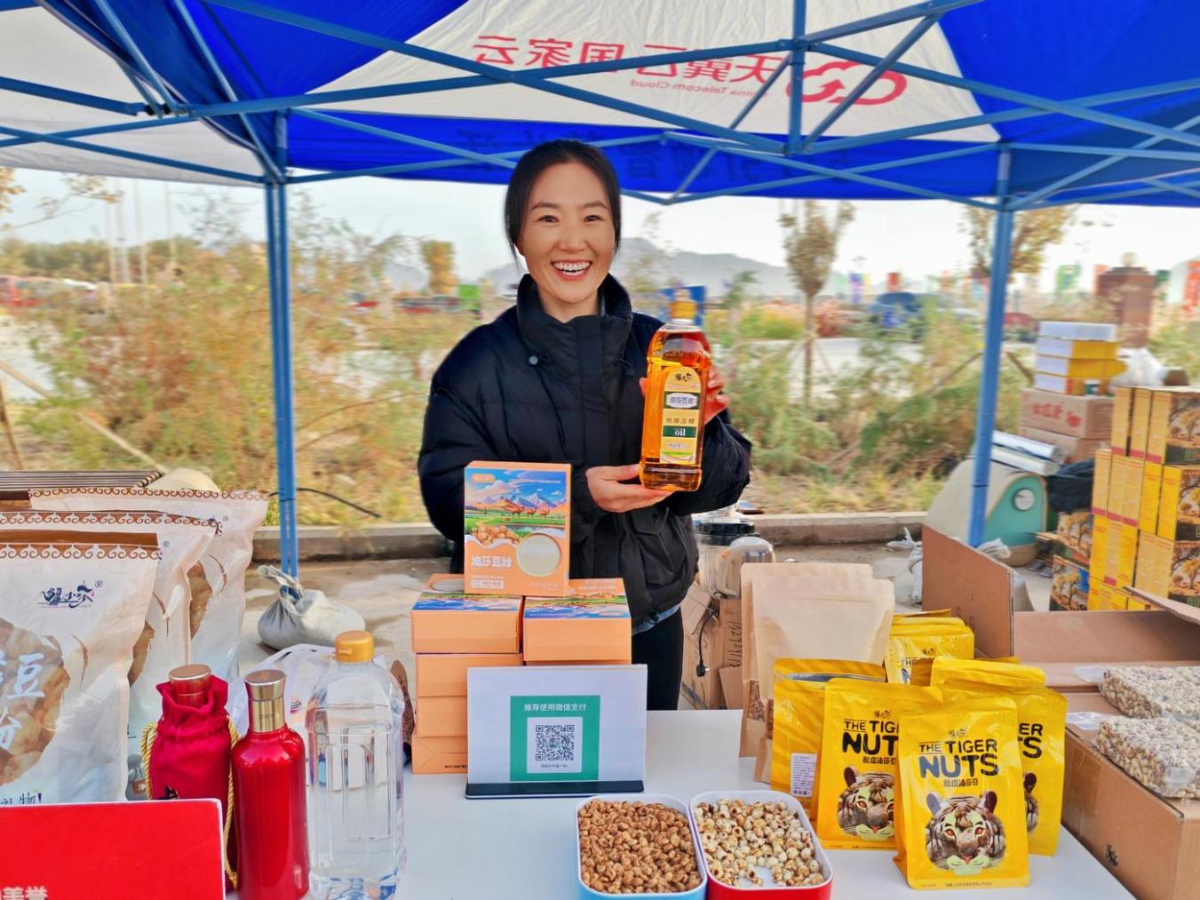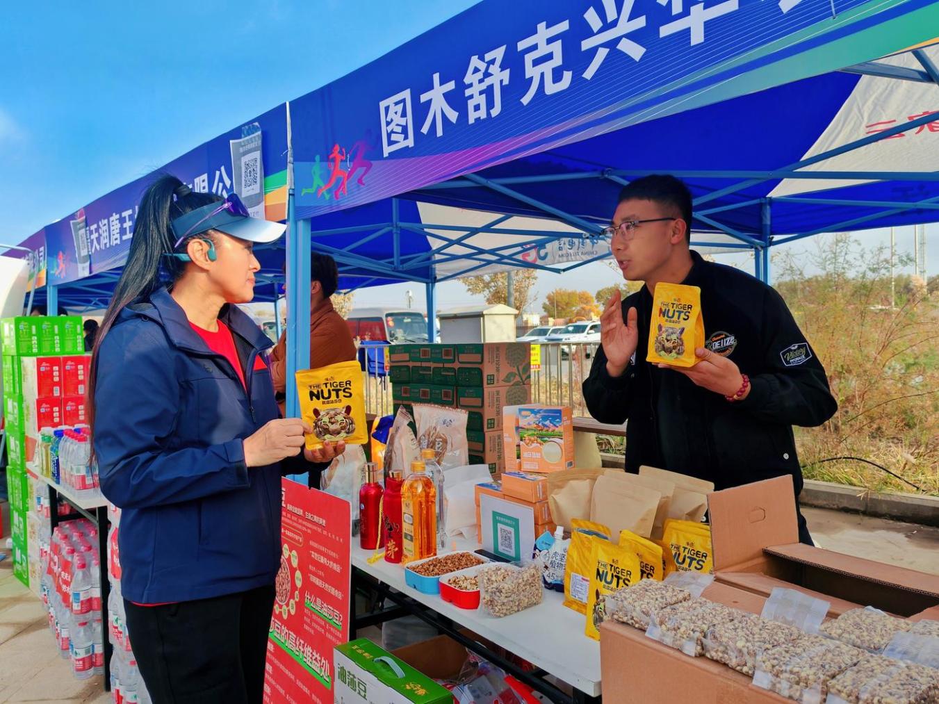赛事组委会特别设置了“特色农产品展示区”,不同于常规补给点布局,该展示区位于终点区域,方便跑者完赛后集中参观选购图木舒克的冬枣、油莎豆、花菇酱等优质农产品。在油莎豆展台前,负责人戴福宏介绍:“油莎豆具有调节血脂、改善肠道健康、抗氧化等功效。它富含膳食纤维、不饱和脂肪酸及矿物质,适合三高人群、减肥者及注重健康饮食的人群日常食用。”中国女子全马拉松纪录保持者孙英杰表示:“这也太适合我的学员们了,他们中很多需要控制身材的或者是有三高的,吃这个简直太放心了。”除了油莎豆,还有其他同样生长在这片绿洲沃土上的特产,被包装成便携小份装,印上了“唐王城文化旅游”品牌标识,成为跑者赛后可以带走的“城市记忆”。