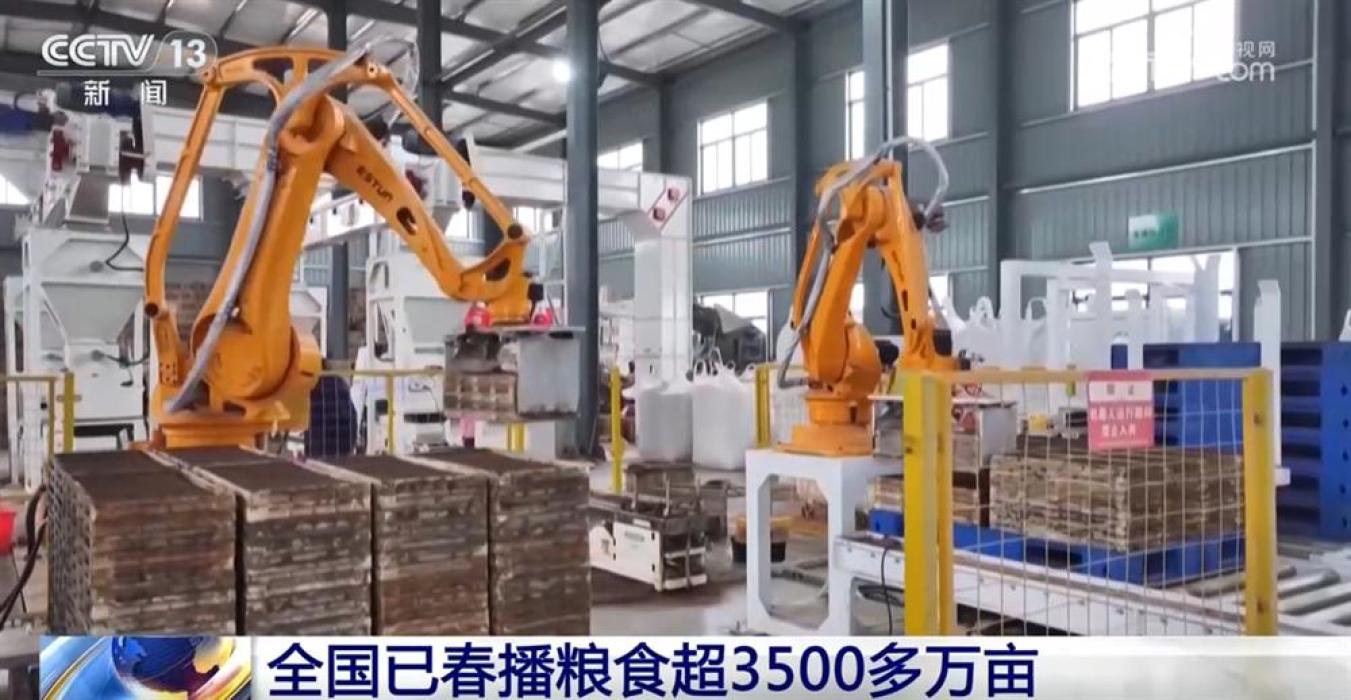 浙江宁波今年计划播栽早稻35万亩。黄家埠镇的这家水稻育秧中心用上了智能协同的四轴机械臂作业,每隔15秒就可以精准抓取10个秧盘,效率从普通流水线的每小时1600盘提升到每小时2200盘。