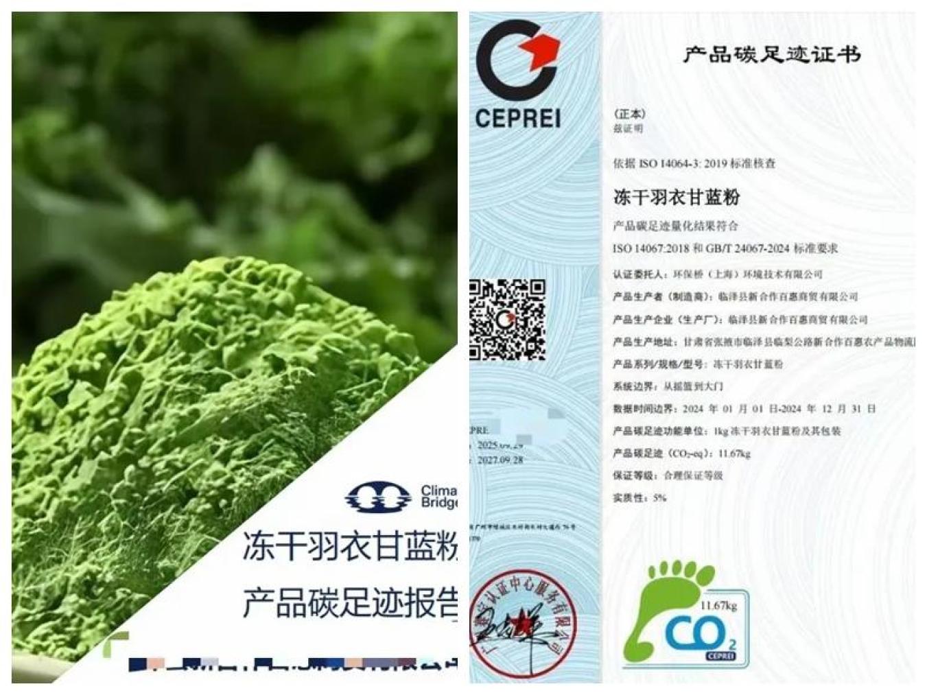 近日,甘肃省张掖市临泽县新合作百惠商贸有限公司生产的冻干羽衣甘蓝粉,成功获得全国首例该品类产品“碳标签”认证。这张薄薄的标签,清晰标示了产品从原料、生产、运输到废弃全生命周期的碳排放数据,不仅成为企业践行环保责任的“信用凭证”,也标志着临泽县在推动农业绿色转型、落实“双碳”战略方面迈出了实质性一步。