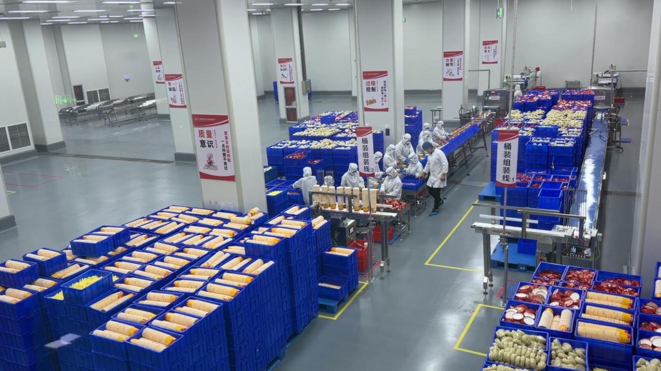 物流园隔壁,河南微念实业有限公司的车间里同样热闹。透过玻璃窗,只见智能化生产线不停转动,一桶桶酸辣粉排着队下线,工人忙着装箱打包。这家企业去年9月才落地,专做“李子柒”“臭宝”等网红酸辣粉,规划了8条生产线,一年能产1.5亿袋(桶)。去年底投产后,现在每天产量已达20万桶。“奔着‘中国酸辣粉之都’的名头来的,原料、包装、物流都在跟前,省心。”生产经理王阳阳说。
