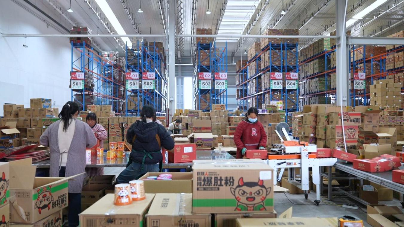京东物流园目前集聚了京东快递、申通、圆通、韵达等公司。企业把货放进仓库,从存储、分拣到发货全包了,物流成本降了近一成,酸辣粉24小时内就能送到全国大部分地区。