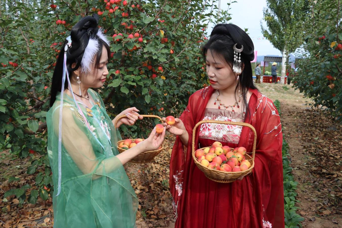 步入汉服打卡区,仿佛穿越时空。游客们身着传统服饰,与挂满累累硕果的海棠树相映成趣,构成一幅流动的古风画卷。不远处,腰鼓表演的欢快鼓声与采摘区游客的欢声笑语相互交织,让整个现场充满了浓郁的节日氛围。在这热闹的场景中,汉服走秀《海棠树下》尤为吸睛。表演者巧妙地将八棱脆海棠果、海棠汁等产品作为道具融入展示,自然流畅地实现了品牌宣传与文化展演的融合,让人眼前一亮。