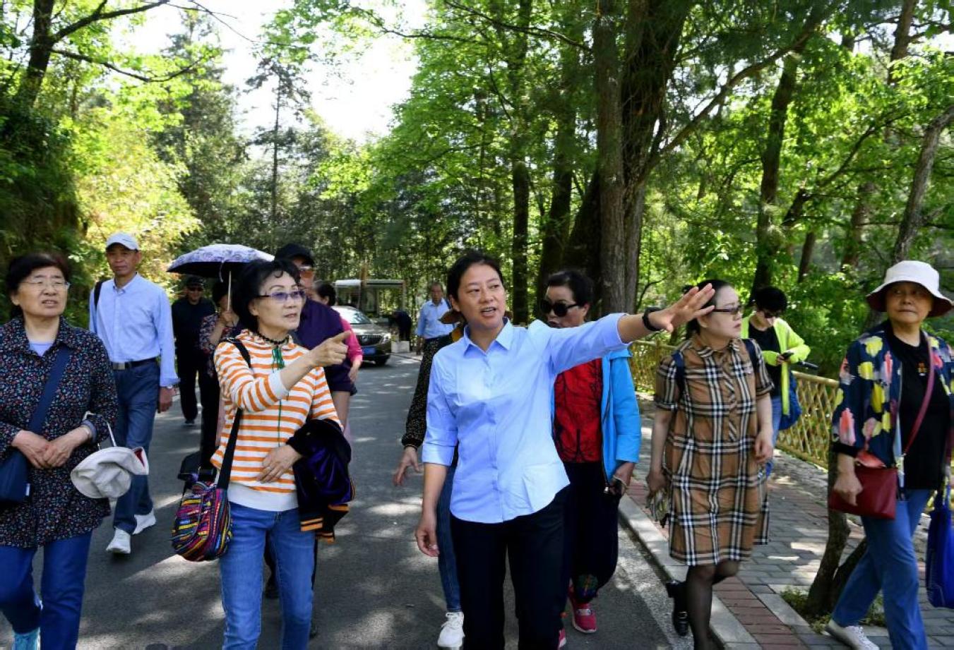 全国政协委员、安徽省金寨县花石乡大湾村党总支第一书记余静(中)向游客介绍大湾村的发展变化。(受访者供图)