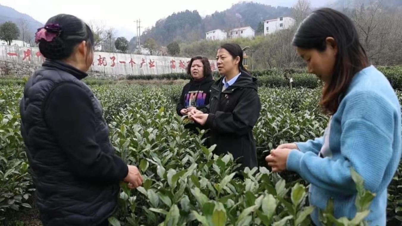 全国政协委员、安徽省金寨县花石乡大湾村党总支第一书记余静(右二)在茶园里和茶农们交流。(受访者供图)