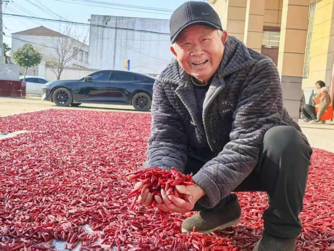 “今年俺就种了两亩朝天椒,八块钱一斤全卖出去了,光辣椒就多挣了快万把块!”2月9日,河南省杞县葛岗镇曹寨村民陈永录站在村室门口的辣椒堆前,他翻晒着红彤彤的辣椒说道。