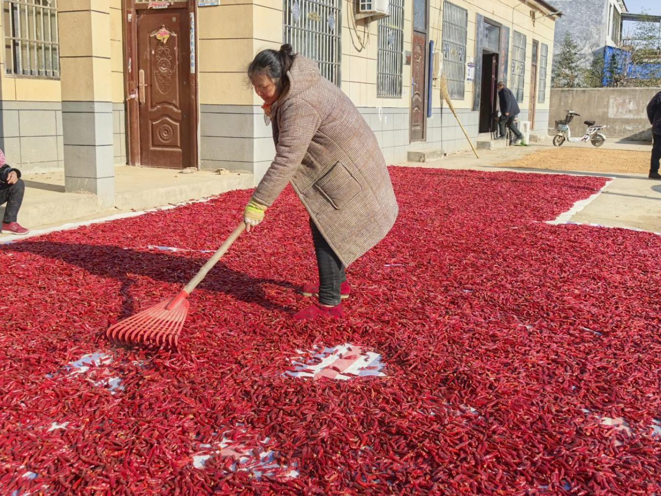 眼下正是辣椒采收晾晒的黄金期,走进葛岗镇曹寨村,房前屋后,处处可见火红的丰收图景。