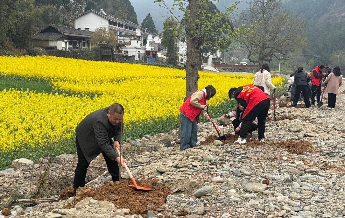 与此同时,在云雾山镇菜籽坝社区,义务植树活动同样开展得如火如荼。全镇党员干部热情高涨,扶苗、定植、浇水,大家严格按照栽植标准,确保“植一片、成一片、活一片、绿一片”。不到半天时间,300余株寓意美好的桃树、李树苗便扎根沃土,孕育着新的希望。“每年参加植树活动,既是义务,也是责任。”正在植树的云雾山镇干部武海蛟说,“希望通过我们的行动,带动更多人参与到植树造林中来,共同为家乡增添绿色风采,让‘植一片绿林,兴一方产业,富一方百姓’成为现实。”
