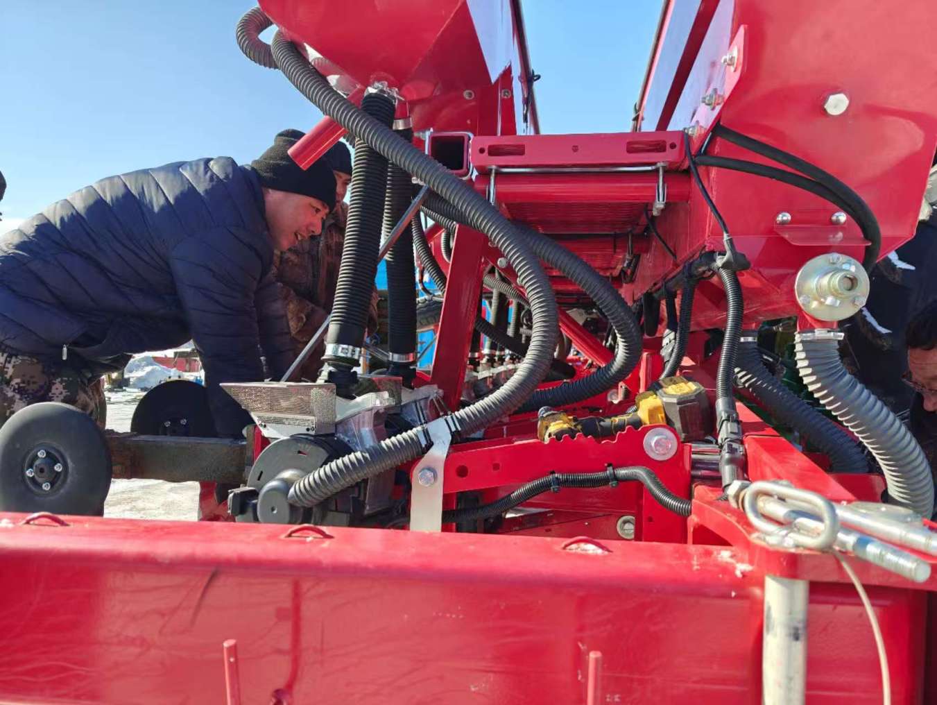 统种站院内,120台套农机如待命的钢铁军团。一台台备春耕机械停放得整齐划一,正等待检修、调试。“大家一定要仔细检查,零部件、发动机、电路、冷却系统和传动系统都要看仔细,确保春耕生产顺利进行。”维修班长正用听诊器般的专注检查收割机。
