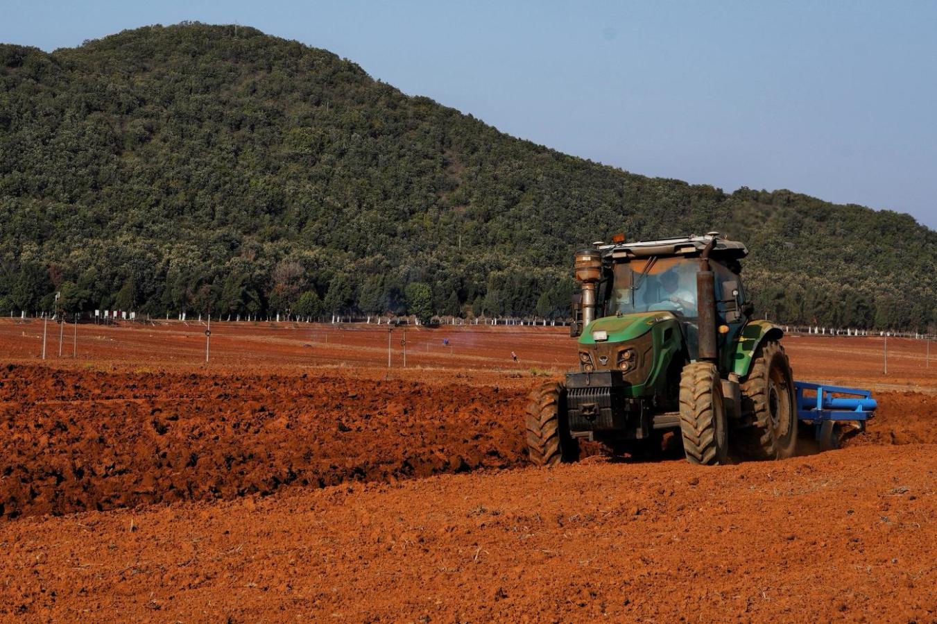 冬日的云南省文山壮族苗族自治州丘北县烟区,拖拉机正在土壤里破土前行,阵阵轰鸣声里,冬耕的节奏坚定而有力;烟后草莓在寒风中探出红红的脑袋,层层叠叠间,展示着土地里的新希望。