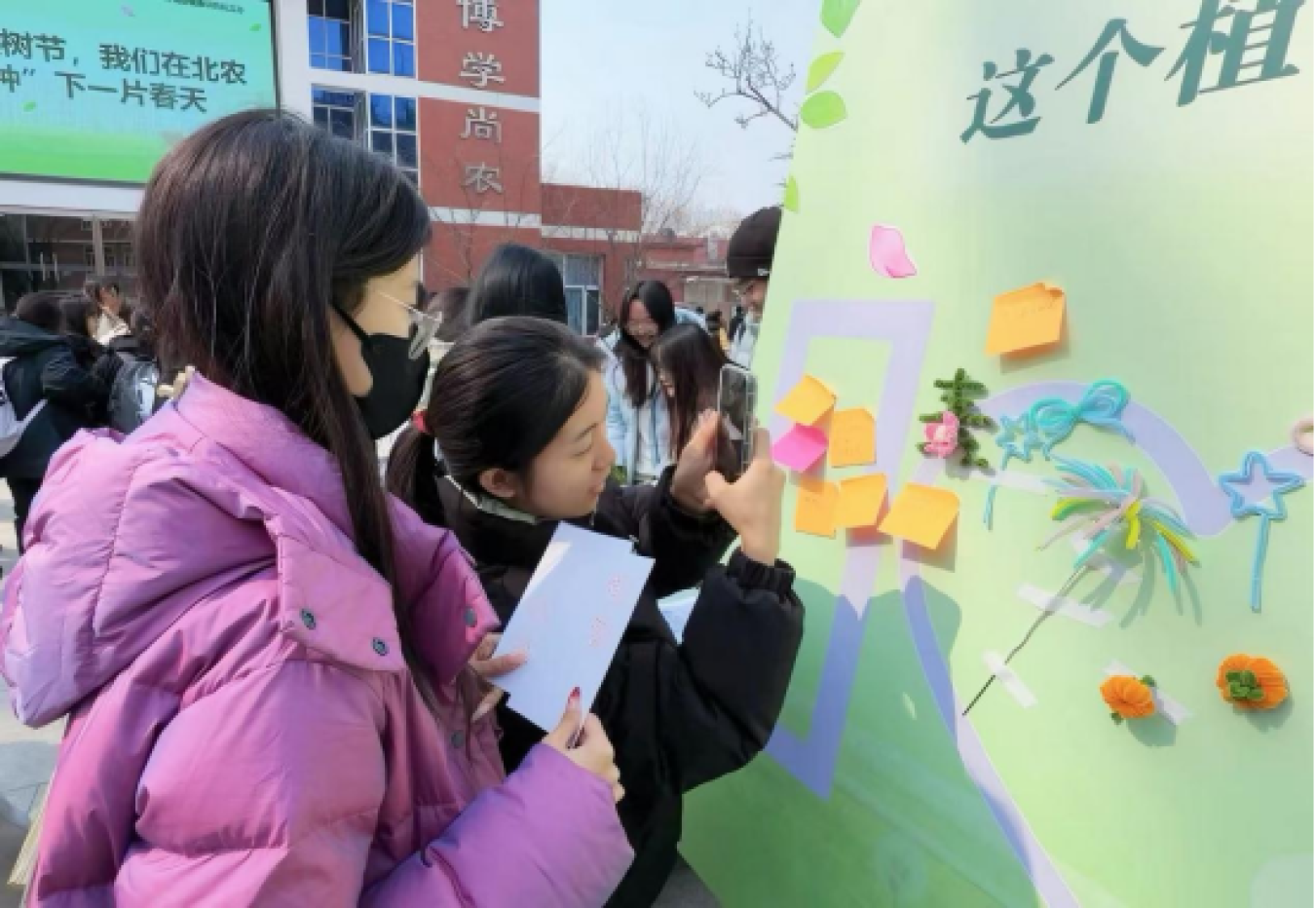 参与活动的同学纷纷写下对学校的美好祝福、对绿色未来的无限憧憬,有人写道:“愿北农的每一棵树都枝繁叶茂,愿我们心中都有一片森林。”有人写下:“这个植树节,我们不仅认识了学校的草木,更许下对地球的温柔承诺。”还有的同学写道:“今天,为美丽校园增添新绿;明天,为绿水青山贡献农科学子力量。”