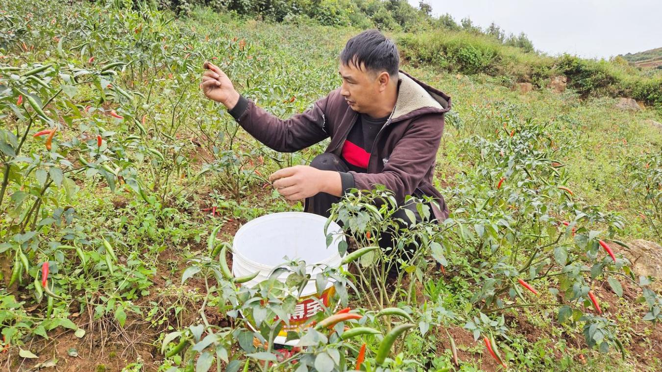 立冬刚过,一场细雨带来几分寒意。云南省红河哈尼族彝族自治州泸西县白水镇果衣村的辣椒地里,34岁的严小龙蹲在地里,手指翻飞间,一个个红辣椒落入身边桶内,“趁现在市价好,抓紧时间摘,明天拉去卖。”