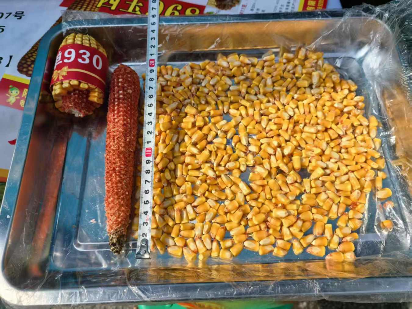 10月26日上午,久违的阳光洒在第三十二届农高会种子展示交易大市场里,陕西奥瑞丰现代种业有限公司展台前,10多株脱了皮的黄晶晶玉米穗连同茎秆和根围成一个近乎两米高的圆柱,红色与绿色的A4纸围贴在圆柱顶部,上面书写着“陕单930”。
