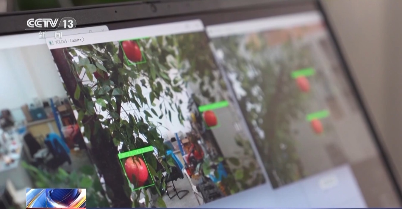 科研人员告诉记者,“双胞胎”机器人摘苹果关键是靠安装在头部和机械臂上的视觉系统。它们就像是眼睛,能精准扫描果树形状、果子的色泽和大小,并立马把这些信息传输给机器人的“大脑”。