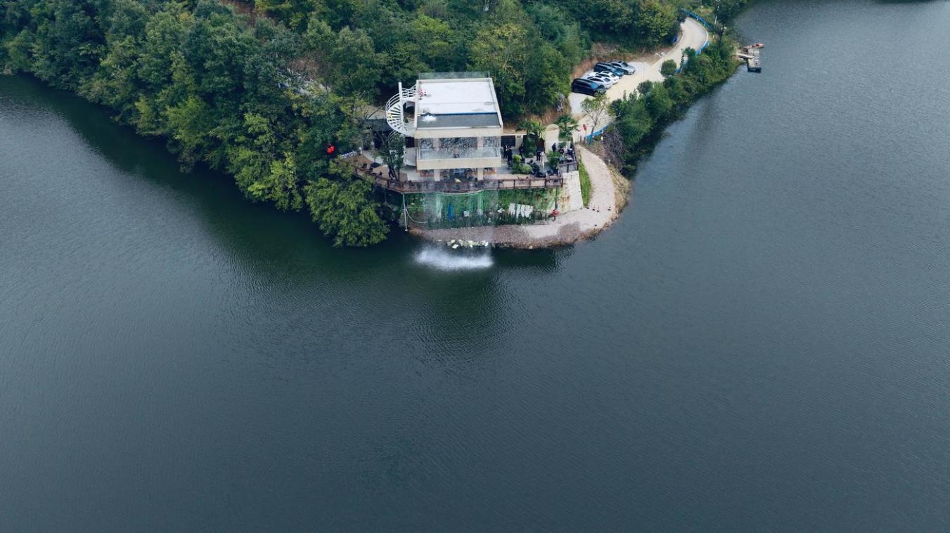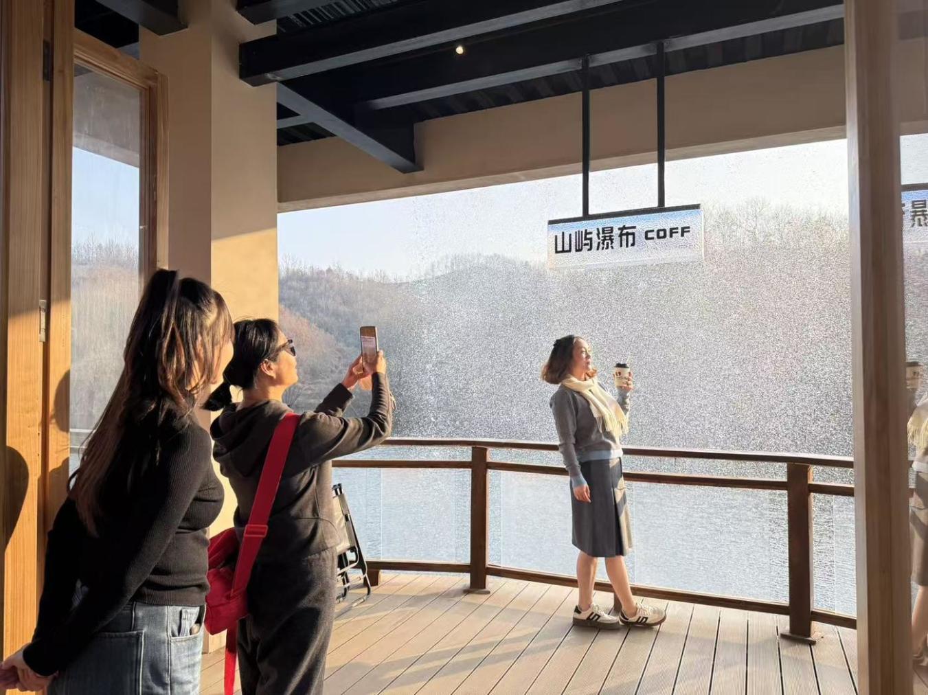 远山如黛,碧水澄澈,一道瀑布自屋顶倾泻而下,水声激荡,雾气缭绕。茶山环抱中,游客闲坐水畔,手捧一杯醇香。这家藏在河南省信阳市浉河区柳林乡甘冲村卧龙水库腹地的“山屿瀑布咖啡”,正以其“观瀑品饮”的创新模式,悄然带动起一片山乡的活力。