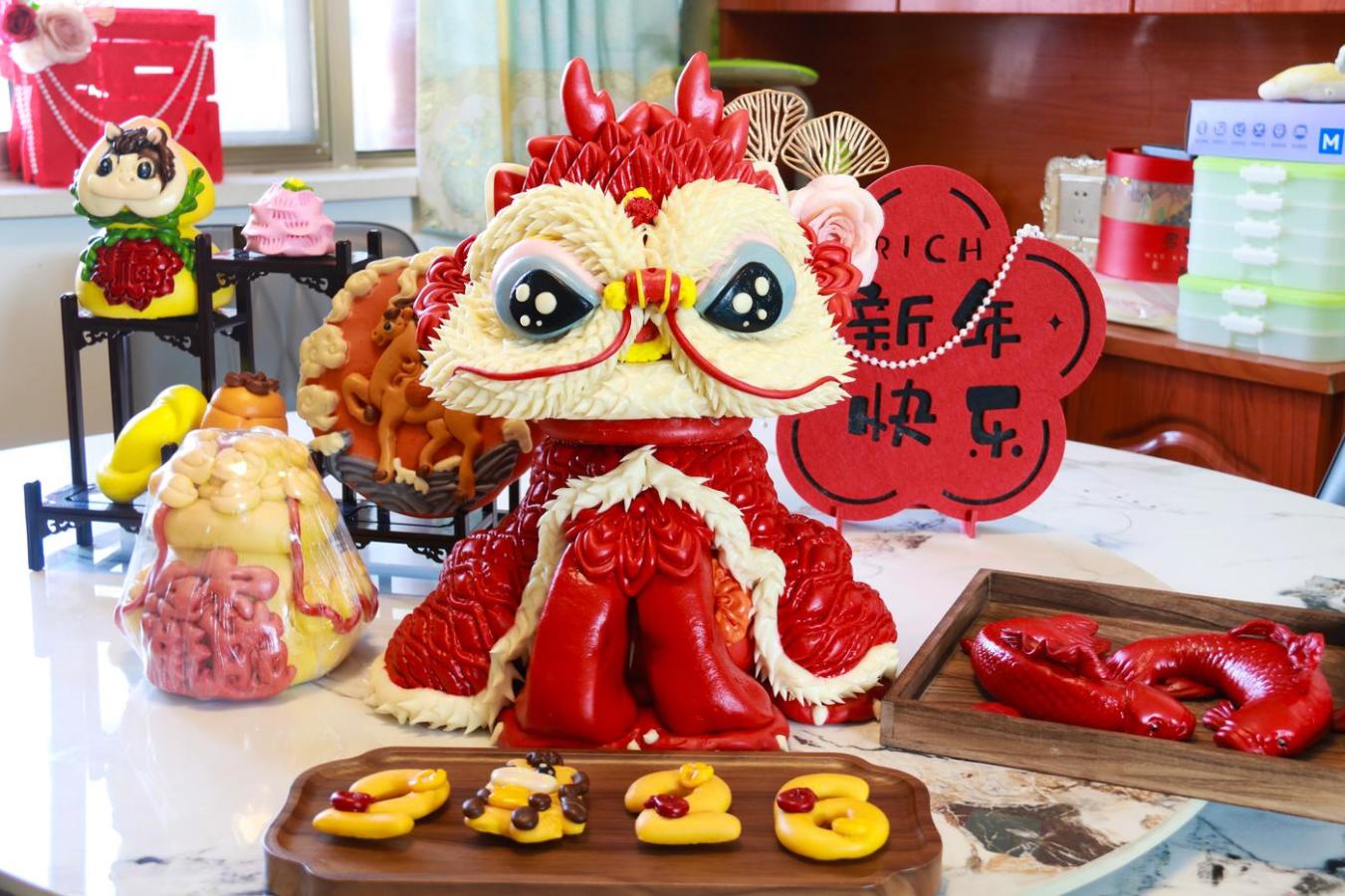 如果说开店做花馍是李文娟融入日常生活的创业实践,那么对精致面塑的追求,则是她内心深处的一场艺术修行。走进她的工作间,仿佛进入了一个精美的艺术世界,那里有她耗时二十多天完成的得意之作——“醒狮”。从切割泡沫雕刻主体,到一点点贴面塑形,再到用喷枪为狮身上的花纹精细上色,每一个步骤都倾注了巨大的心力。“一旦上色不均匀,整个作品就报废了。”她回忆道,那些为了完成作品而通宵达旦的日子,早已是家常便饭。
