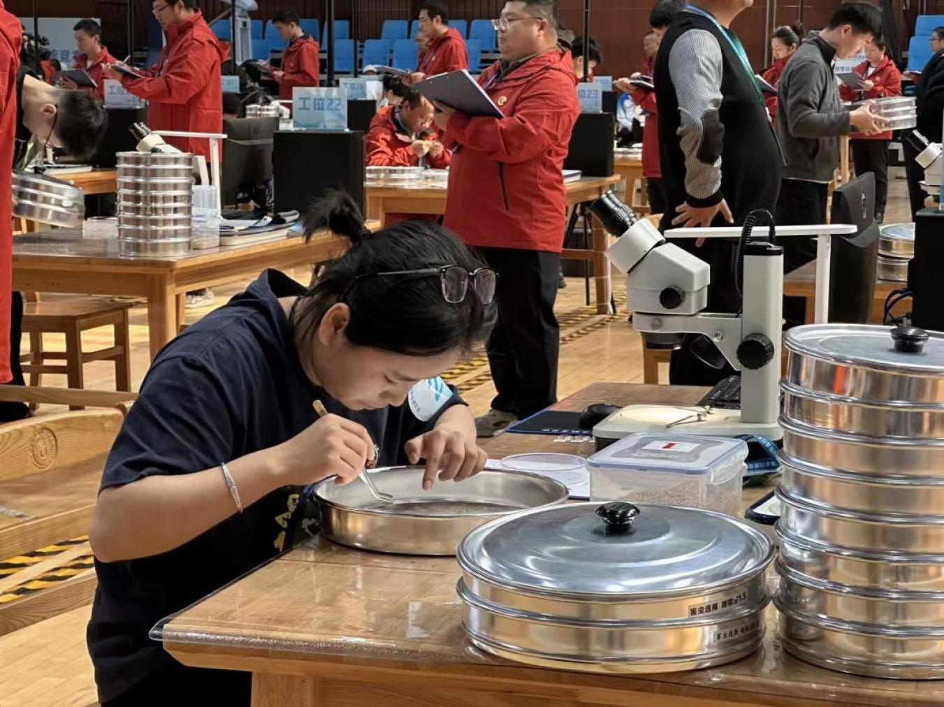 在粮油保管员计算机粮情检测与分析比赛现场,电脑查看粮情数据、嚼几粒粮食判断水分、晃动谷物选筛工具筛虫、用显微镜观察……第三次参加国赛的江西队选手钟声敏动作娴熟,成为该组最快完赛的选手之一。她告诉记者,这些都是日常工作中的必备技能,但竞赛对速度和精准度提出了更高要求。