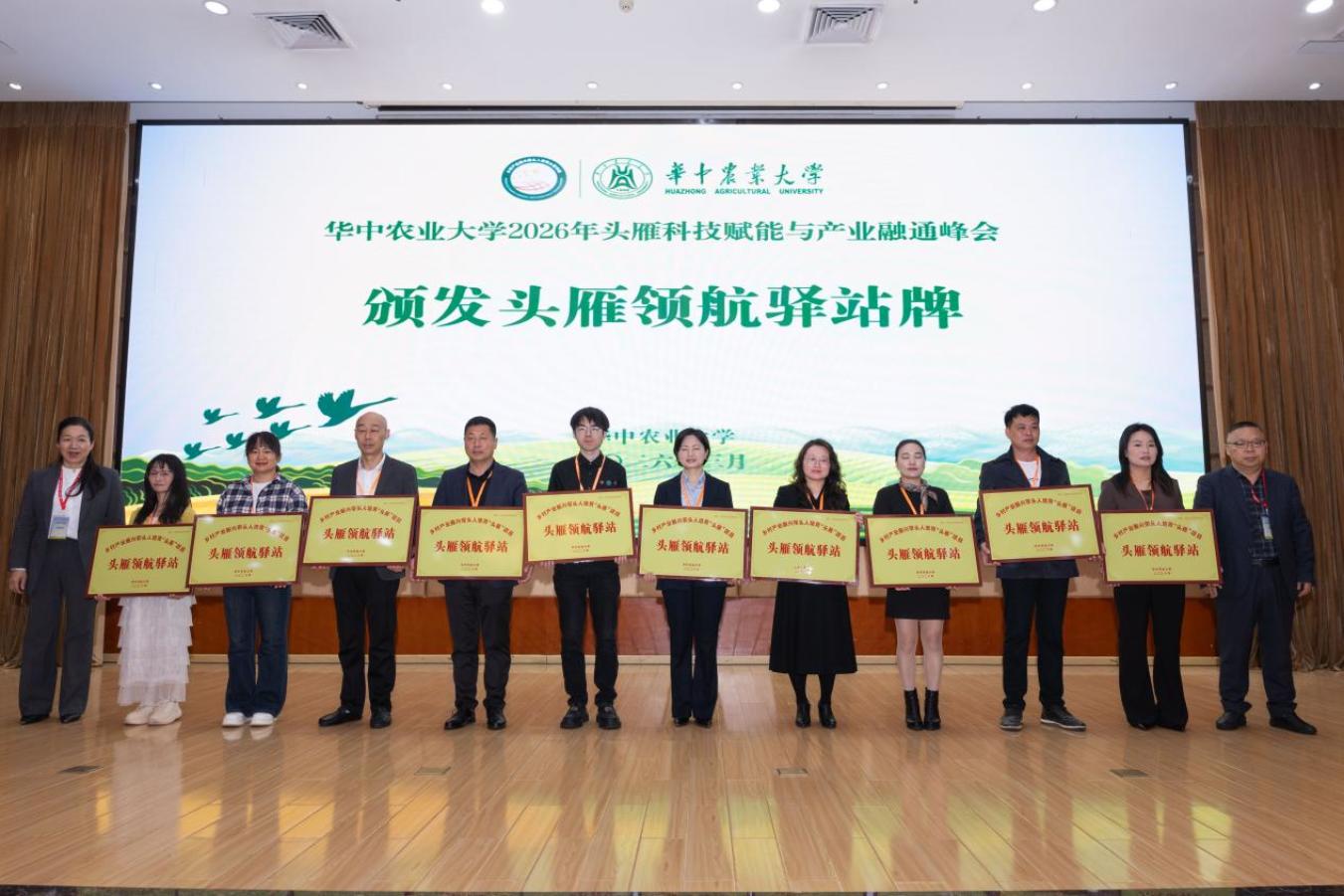 会议期间,华中农大与相关“头雁”企业达成专家工作站、科技小院建设意向,并共建大学生教学实习基地、暑期社会实践基地,现场为40名“头雁”学员颁发“头雁”领航驿站牌,搭建起“科技赋能+头雁链动+校地协同”支撑体系。