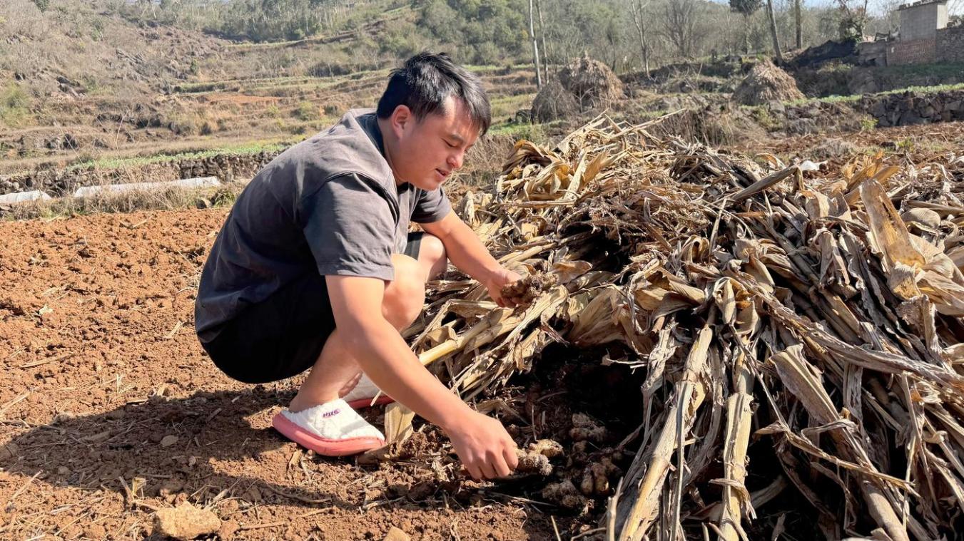 玉米秆厚厚铺在土垄上,阮鸿飞蹲下,轻轻拨开一角,露出底下密密匝匝堆捂着的姜种。紫红的嫩芽从姜块顶端探出,蜷着,像还没睡醒。这里埋着近5000公斤姜种,能栽20亩地。