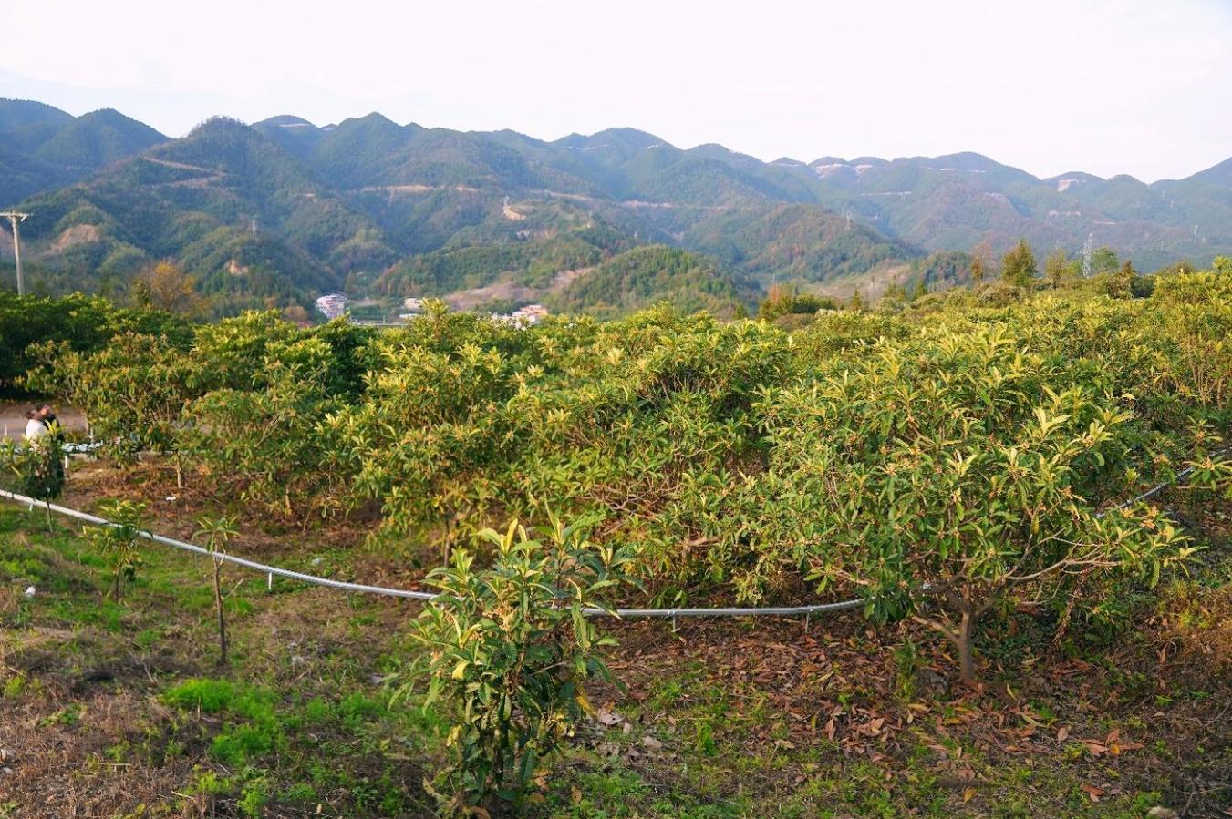 仲冬时节,幕阜山区,在湖北省咸宁市通山县大畈镇板桥村的梯田里,新栽的枇杷苗迎风挺立,暖阳打在山坡上为果园镀上一层金色。通山县地处鄂东南边陲,是华中地区的枇杷主产区。大畈镇是老区库区镇,现有枇杷种植面积2.55万亩,带动镇域1.52万人从事种植、加工、销售等相关产业,被誉为百姓致富的“黄金果”。