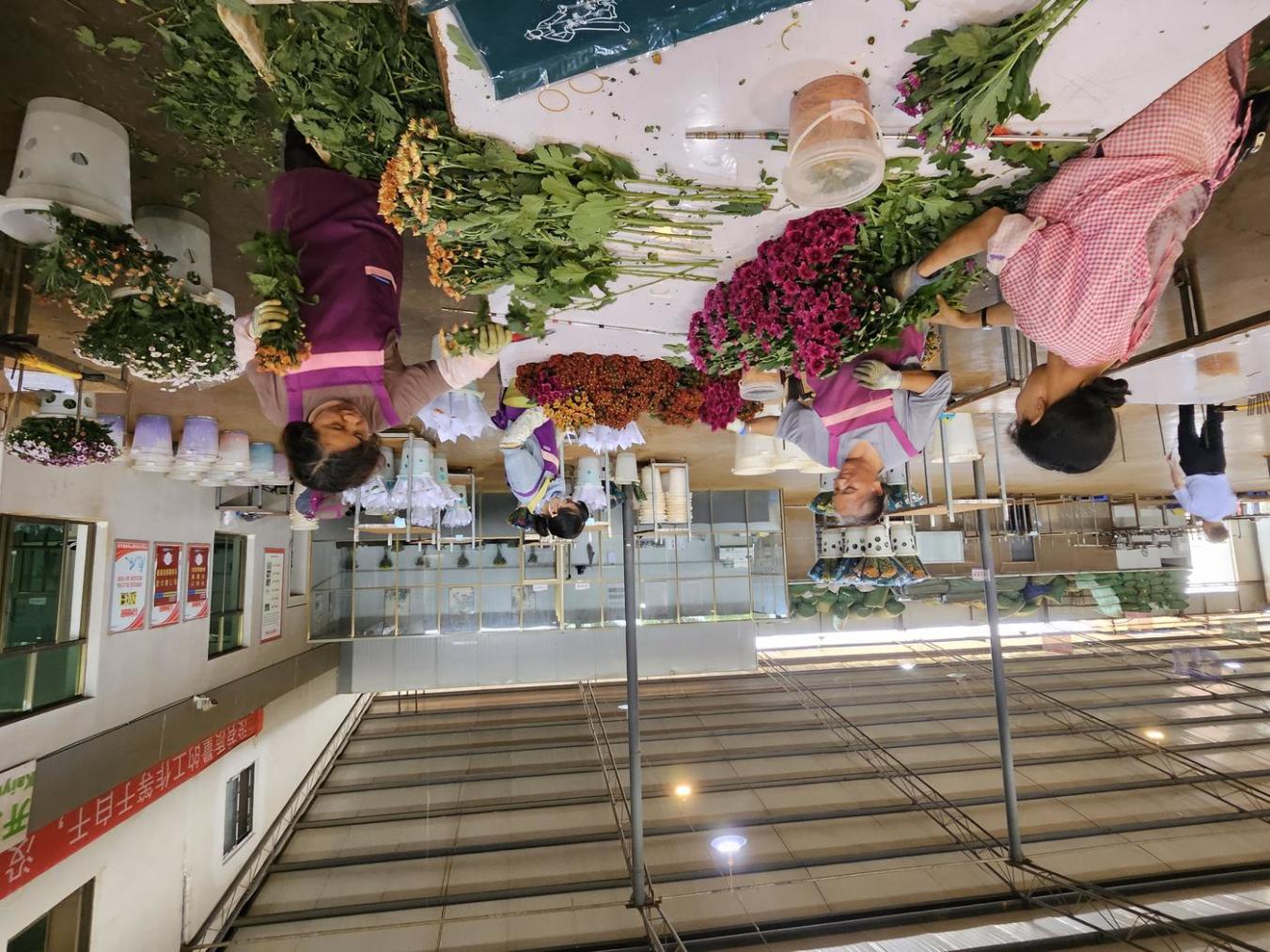 红河州开远市花卉产业园区内虹华园艺的员工为出口日本的鲜菊花作打包前准备工作。