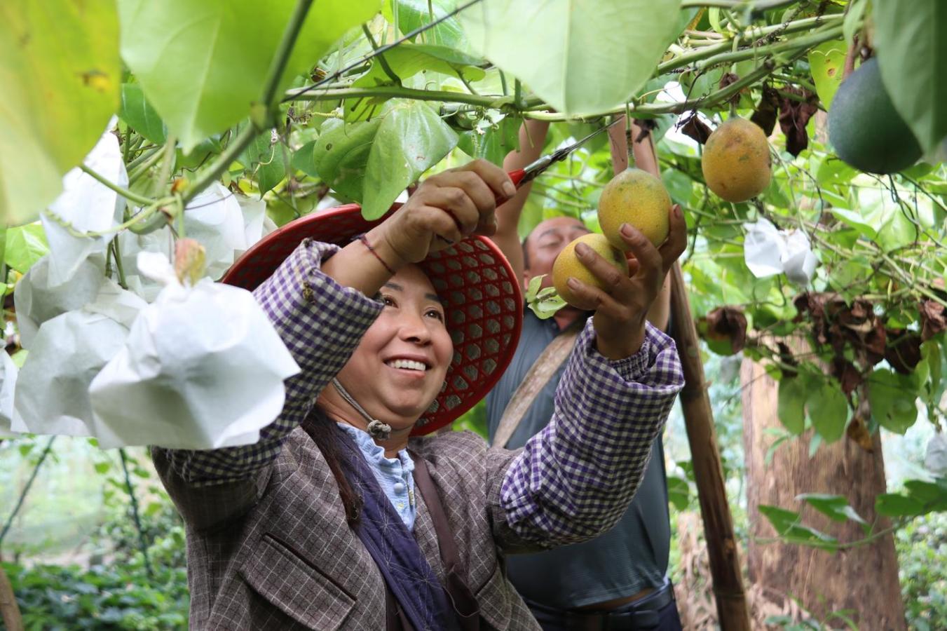 近日,在蚂蚁堆乡白河村党总支书记字树光家的热情果基地,有成人巴掌大的叶子把天空遮得只剩碎银般的阳光,青绿的藤条上既有含苞待放的花骨朵,又挂满一个个拳头大小的热情果。在绿叶的掩映下,成熟的黄色果子格外鲜亮,十分诱人。果架上原本高1.8米的铁线被一串串热情果压低了高度,字树光的妻子和亲戚前来采收,当天就把果子拉送至合作商手里。