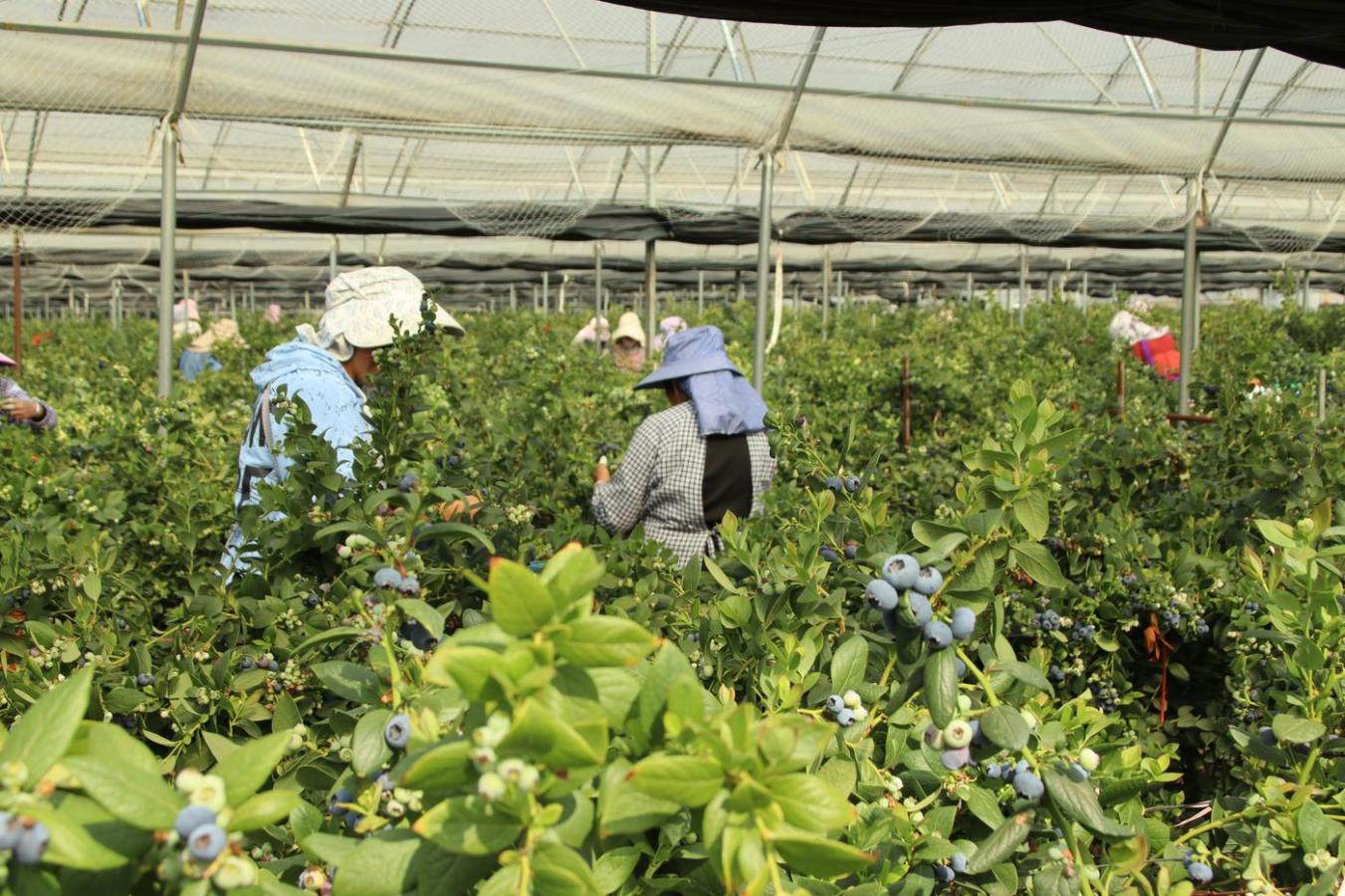 “慢点摘,要轻,果粉掉了就不值钱了。”基地负责人刘建华嘴里念叨着,手上的动作却一刻没停。不远处,采摘工人们麻利地采摘蓝莓。