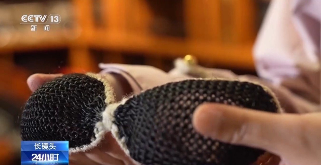 总台记者发现了一副用牦牛毛编织的墨镜。以前牧民非常有智慧,他们在雪天会带上牦牛毛编织的墨镜,防止白雪刺眼。记者戴上之后,可以非常清楚地看到远方。