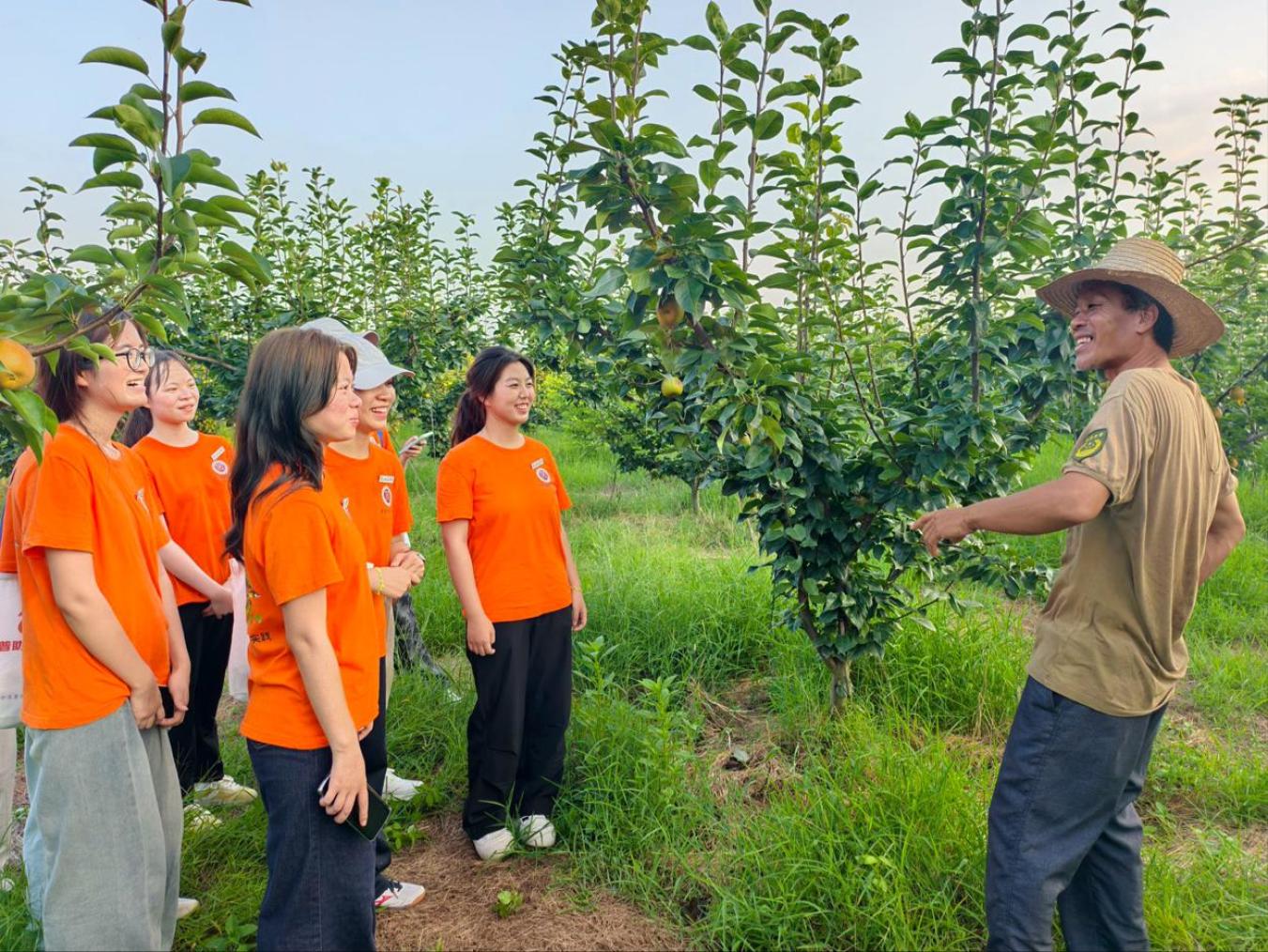 实践队发现,当地群众在拓展农产品销路时,常因方言壁垒导致与外地收购商沟通受阻,据此,实践队明确工作方向——以推普工作为抓手,帮助群众提升语言表达能力,使普通话成为连接乡村与市场的沟通桥梁。硕果盈枝的梨园间,当地侗族果农向实践队队员系统传授梨品辨识知识。他们现场采摘翠冠梨与黄花梨,从外观、触感、气味等维度细致讲解二者的差异。队员们凝神聆听、亲手比对,在实践中熟稔了梨品辨识的专业技能。