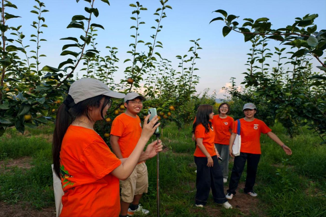 实践队成员在果园直播助农。孙浩杰 摄
