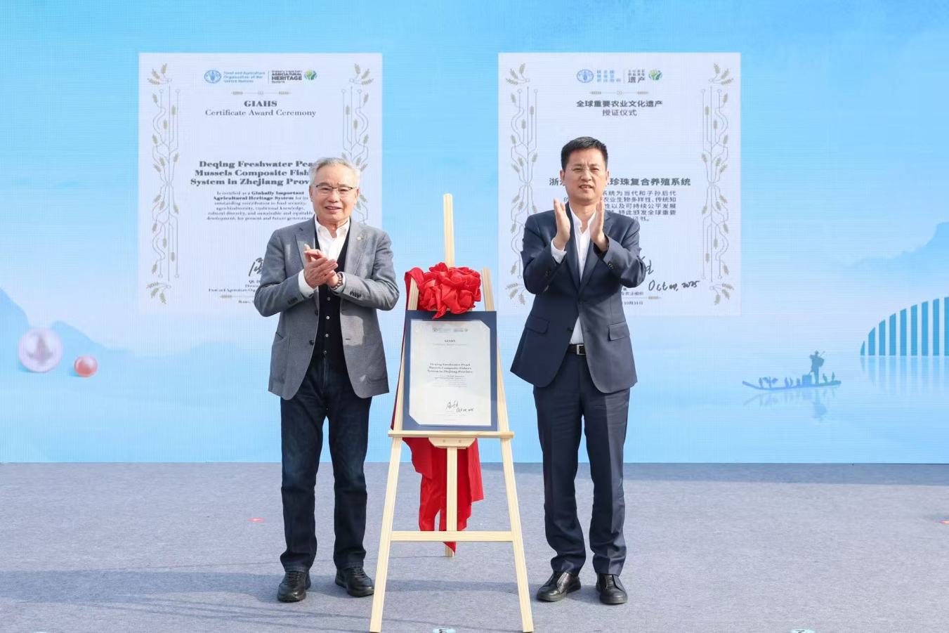 作为中国首个水产养殖类、世界首个以珍珠为核心的全球重要农业文化遗产,德清珍珠系统今年5月19日被联合国粮农组织(FAO)正式列入名录,10月31日在罗马正式授奖。德清县借着亮牌活动首次向社会各界展示其深厚的千年珍珠文化与现代产业活力,活动在全球重要农业文化遗产宣传片中拉开帷幕,展现了全球农遗的发展脉络,从起源至今全球总量102个,到中国25个、浙江6个全球重要农业文化遗产的格局,最终聚焦德清珍珠系统的历史脉络与生态价值。