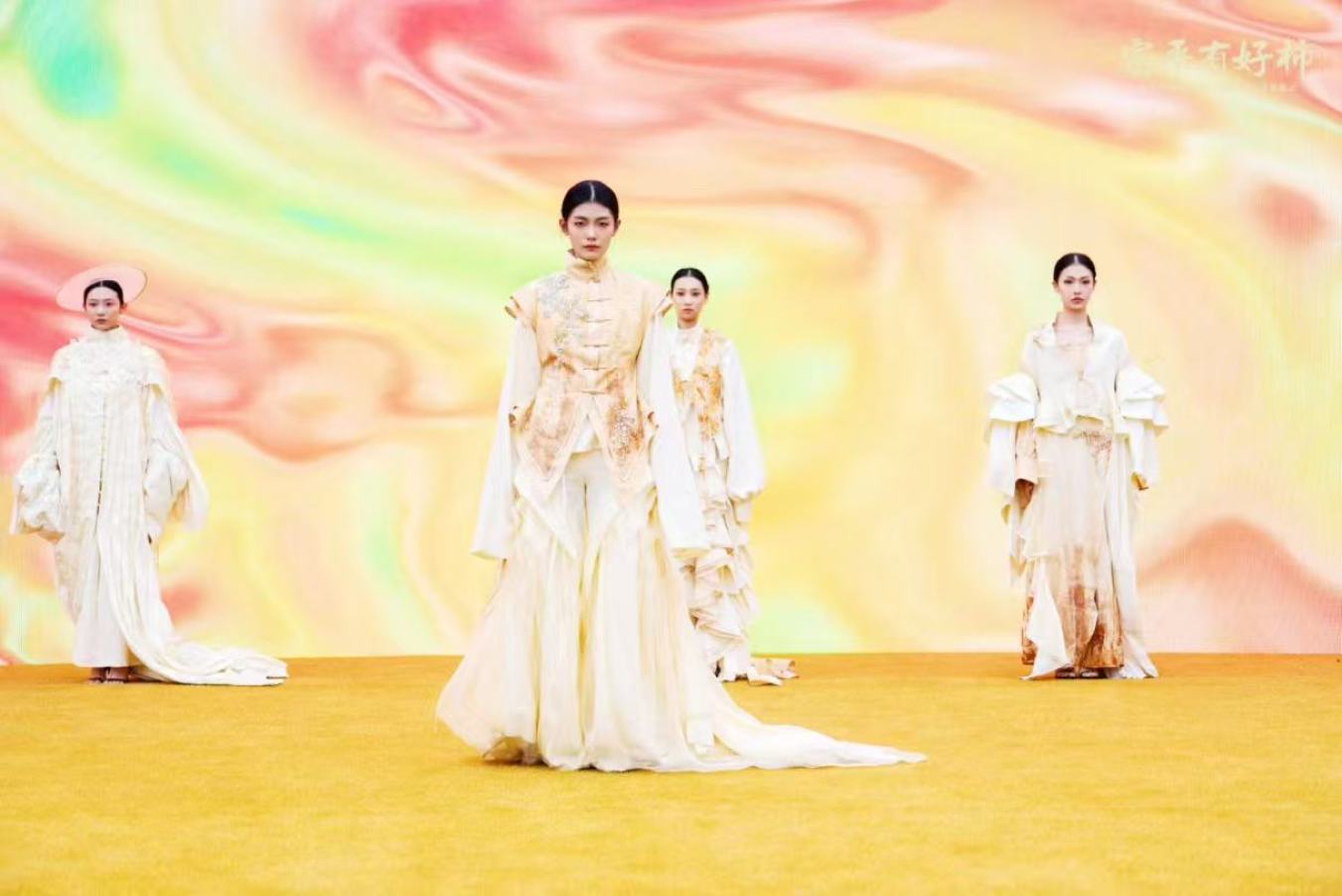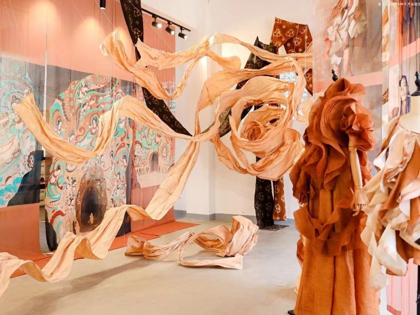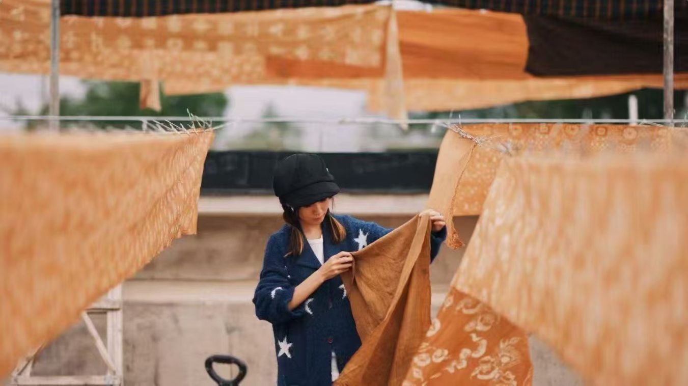 在湾里村,杨维娜作为柿染技艺的传承人,她将一方工作室打造成了充满温度与创造力的天地。走进其中,深浅不一的柿染布匹如流云般从房顶垂落,它们在阳光下静置、呼吸,逐渐定格成淡雅的琥珀色调。这些布料随后被巧手制成各式工艺品,衣服、装饰、背包——每一件都承载着自然与时间的印记。