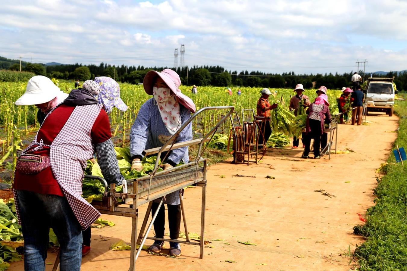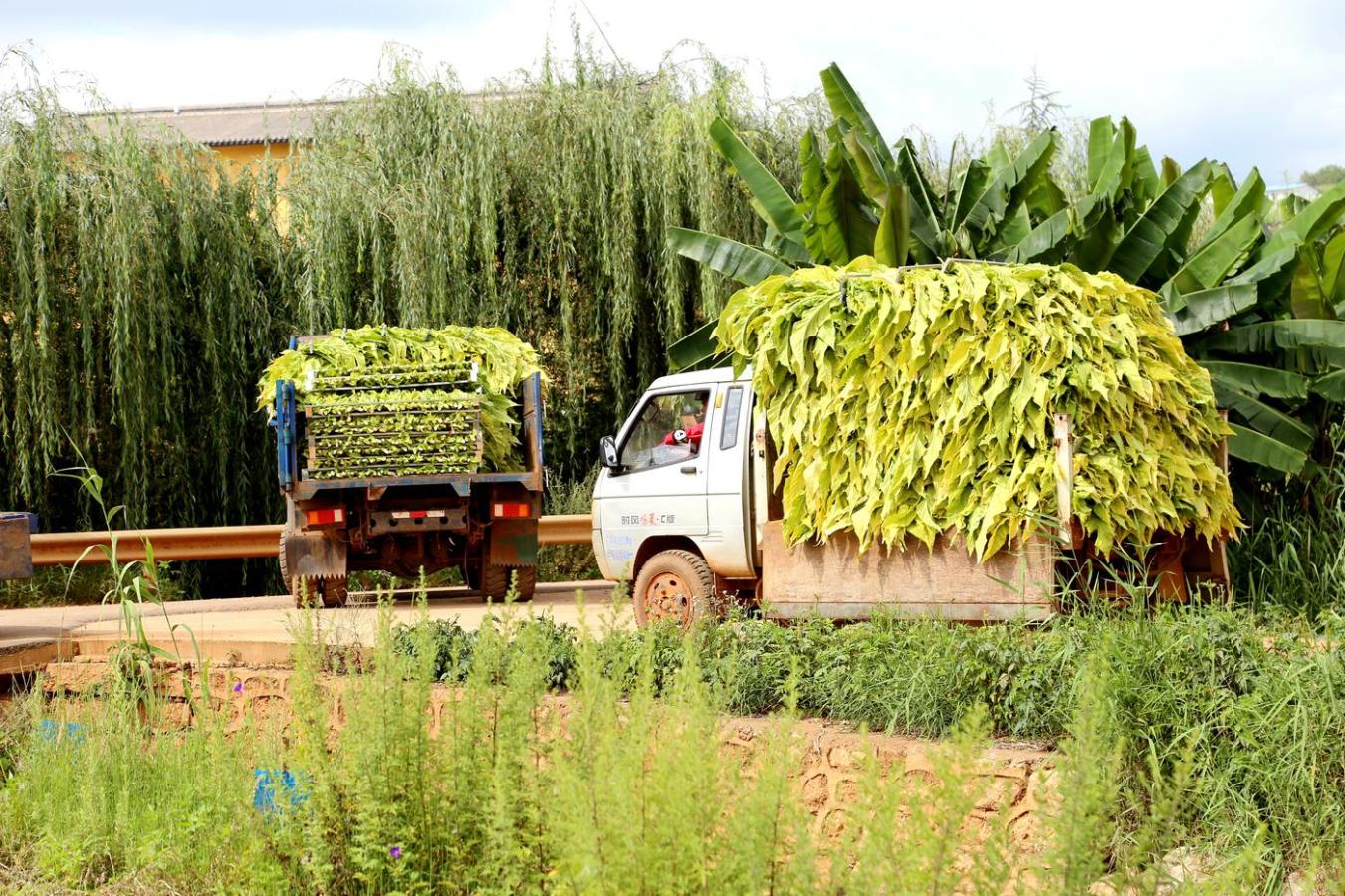 立秋后,烟叶黄。现在,云南省宣威市板桥街道的烟叶全面进入烘烤季。在烘烤工场不远处,200余亩烟叶已全部进入上部叶烘烤期。在烟叶站烘烤科技员的组织和指导下,40多个村民正在忙着砍烤烟叶,有的在田里收割,有的在用机器编杆,路上的车子正将编好的带茎烟叶运送到烘烤工场去烤。