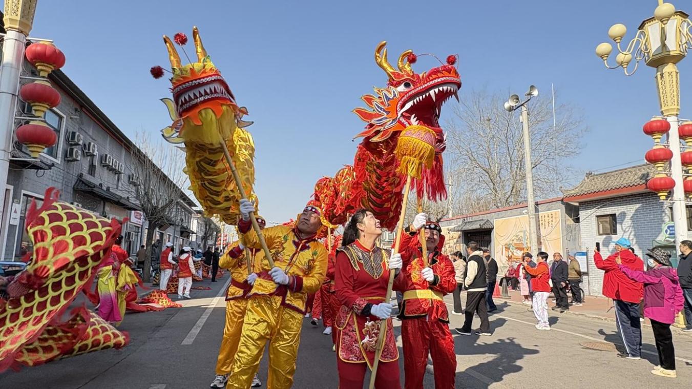 北京大兴区三间房村举办“龙抬头”民俗花会踩街活动
