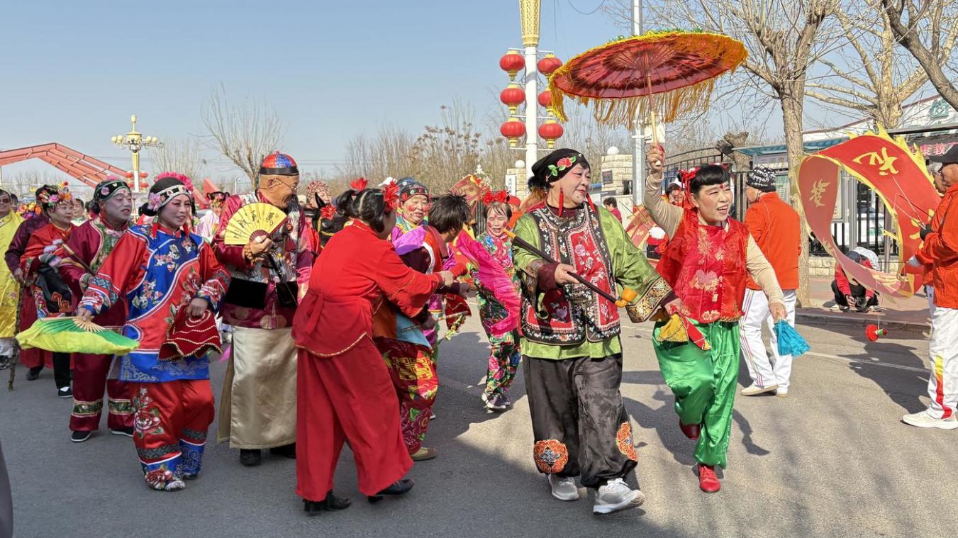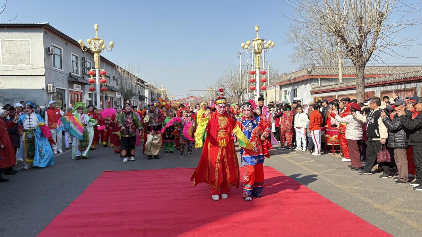 巡游结束后,定点民俗表演在村中广场继续火热进行。而在被誉为“京南戏曲第一楼”的文化阵地内,丝竹悠扬,唱腔婉转。叁间房戏曲社的村民们粉墨登场,为乡亲和戏迷朋友们带来了评剧《三看御妹》《杨八姐游春》、京剧《红梅赞》《赤桑镇》等经典选段。字正腔圆的演唱,韵味十足的表演,让台下观众如痴如醉。这座由村里打造的文化地标,连同全国首个乡村公共文化驿站、配套的美术馆、图书馆、“三间房会客厅”等,共同构成了村民“抬脚就到”的文艺生活圈,将“小而美、小而精”的文艺服务送到了每家每户。