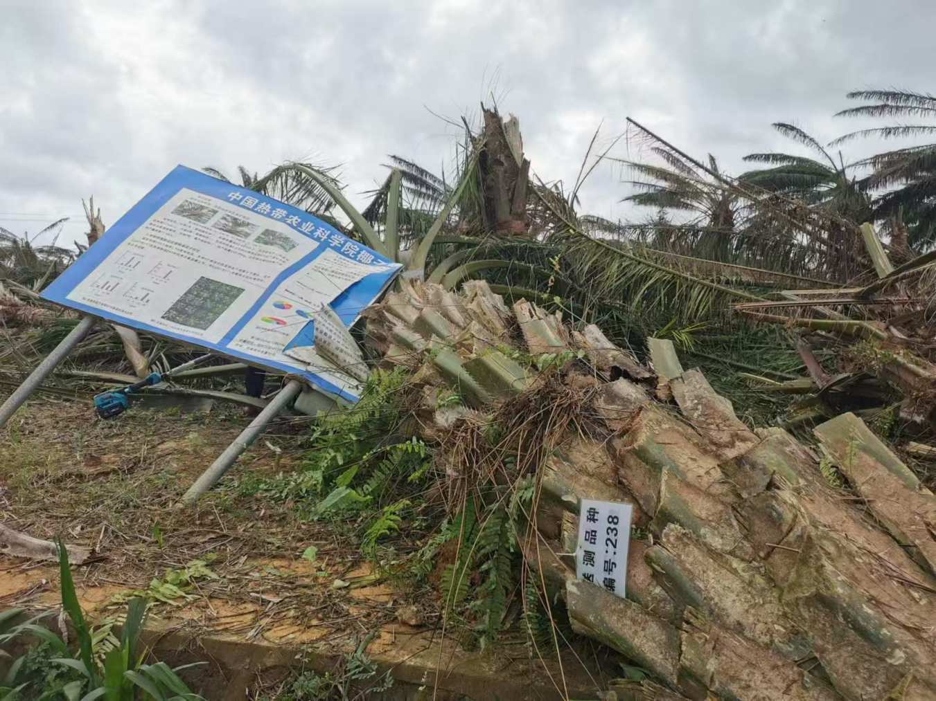 9月6日,超强台风"摩羯"正面袭击文昌市,重创文昌的重要基础设施和产业,极大破坏了人民群众的生产生活秩序。受台风肆虐,椰子所各级种质资源圃和试验示范基地内断水断电,一大批宝贵的资源或实验材料被风撕裂、刮断、吹倒,其中椰子倒地和折断35%以上、槟榔60%以上、油棕50%以上,油茶倒伏占70%以上;重要基础设施、仪器设备等破坏严重,包括围栏倒塌、科研大棚损毁、树木倒伏堵塞道路等灾情。