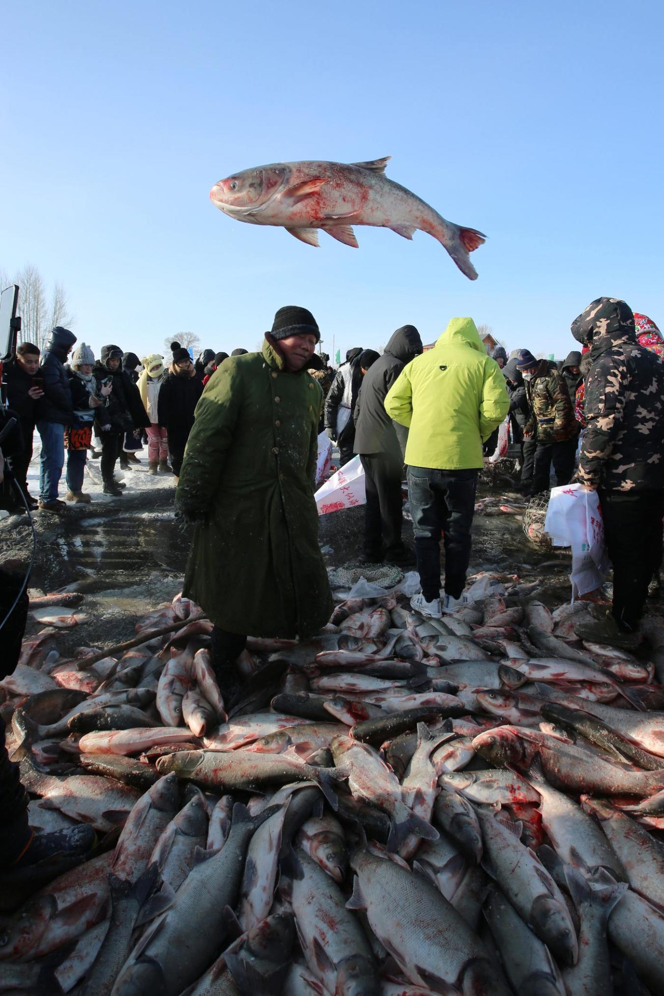 出鱼啦!渔把头一声令下,全场的欢呼声达到顶峰。绞盘缓缓转动,数百米长的巨网从冰洞里慢慢拉出。下一秒,无数银色的大鱼“腾”地跃出水面,在冰面上翻腾跳跃,雾气缭绕间,“冰湖腾鱼”的壮观景象让现场瞬间沸腾。游客们挤到冰洞边,有的举着相机抓拍。
