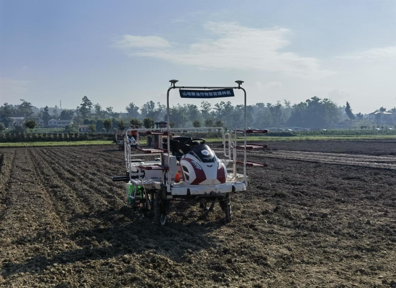 旱地旁,山地电控智能播种机可实现“一机多季复用”,适配水稻、油菜等多作物播种;山地无人驾驶粮油播种机则将起垄、施肥、旋耕、播种、覆膜一体,融合农机农艺,适配大豆、玉米、高粱、油菜等多种作物。